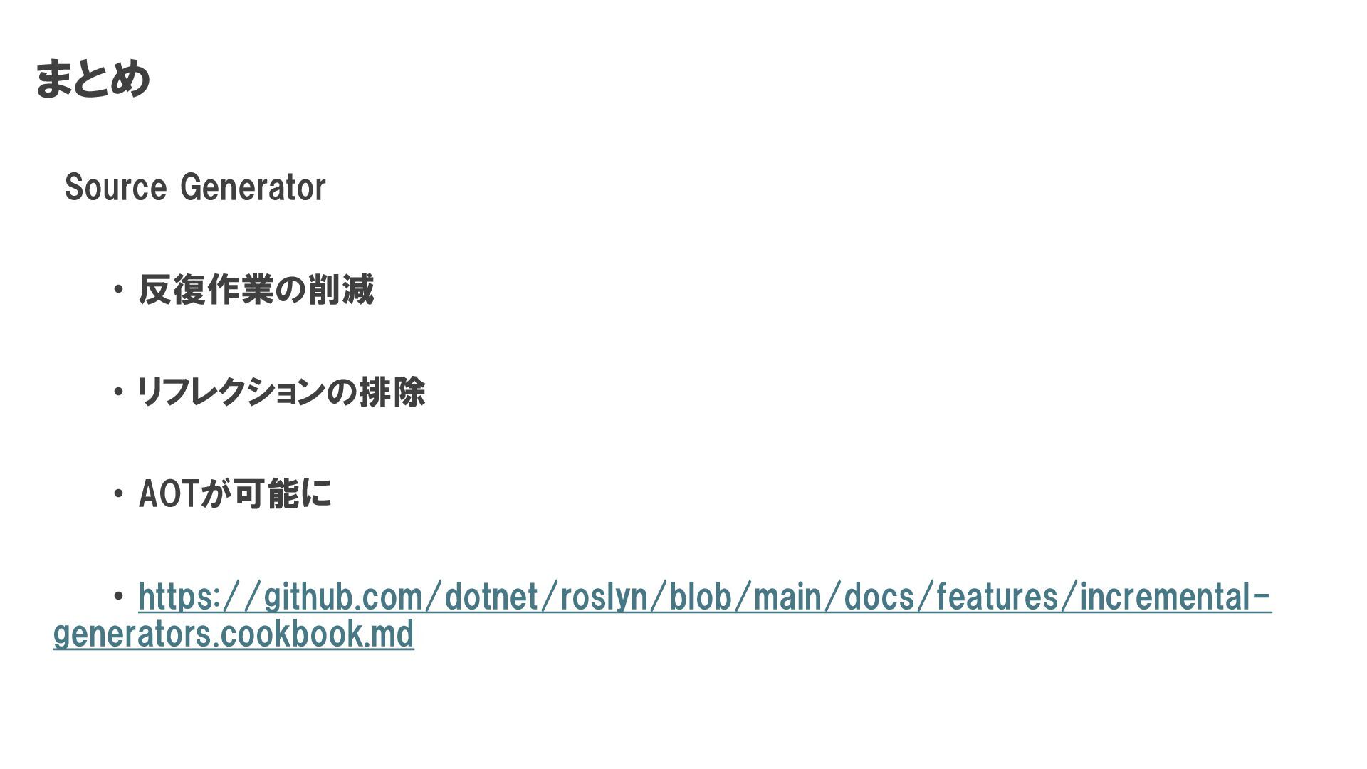5. まとめ Source Generator ・ 反復作業の削減 ・ リフレクションの排除 ・ AOTが可能に ・