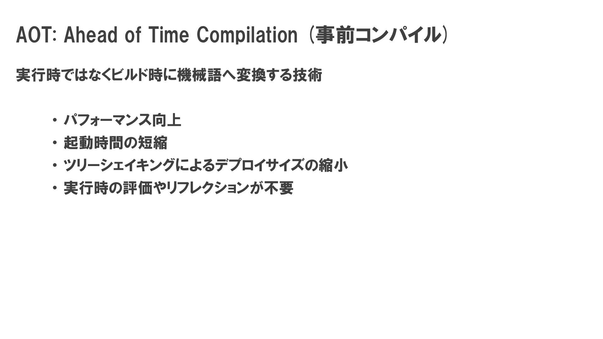 3. AOT: Ahead of Time Compilation (事前コンパイル) 実行時ではなくビルド時に機械語へ変換する技術 ・ パフォーマンス向上 ・
