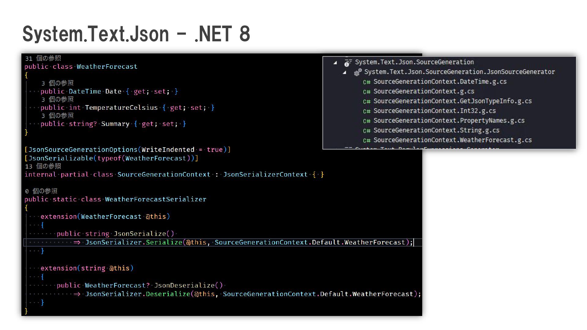 実行時のパフォーマンスが向上 ・ 新しいC#ソースファイルを生成し,自動的に追加 ・ リフレクションを排除 ・ AOTコンパイルとツリーシェイキングを可能に