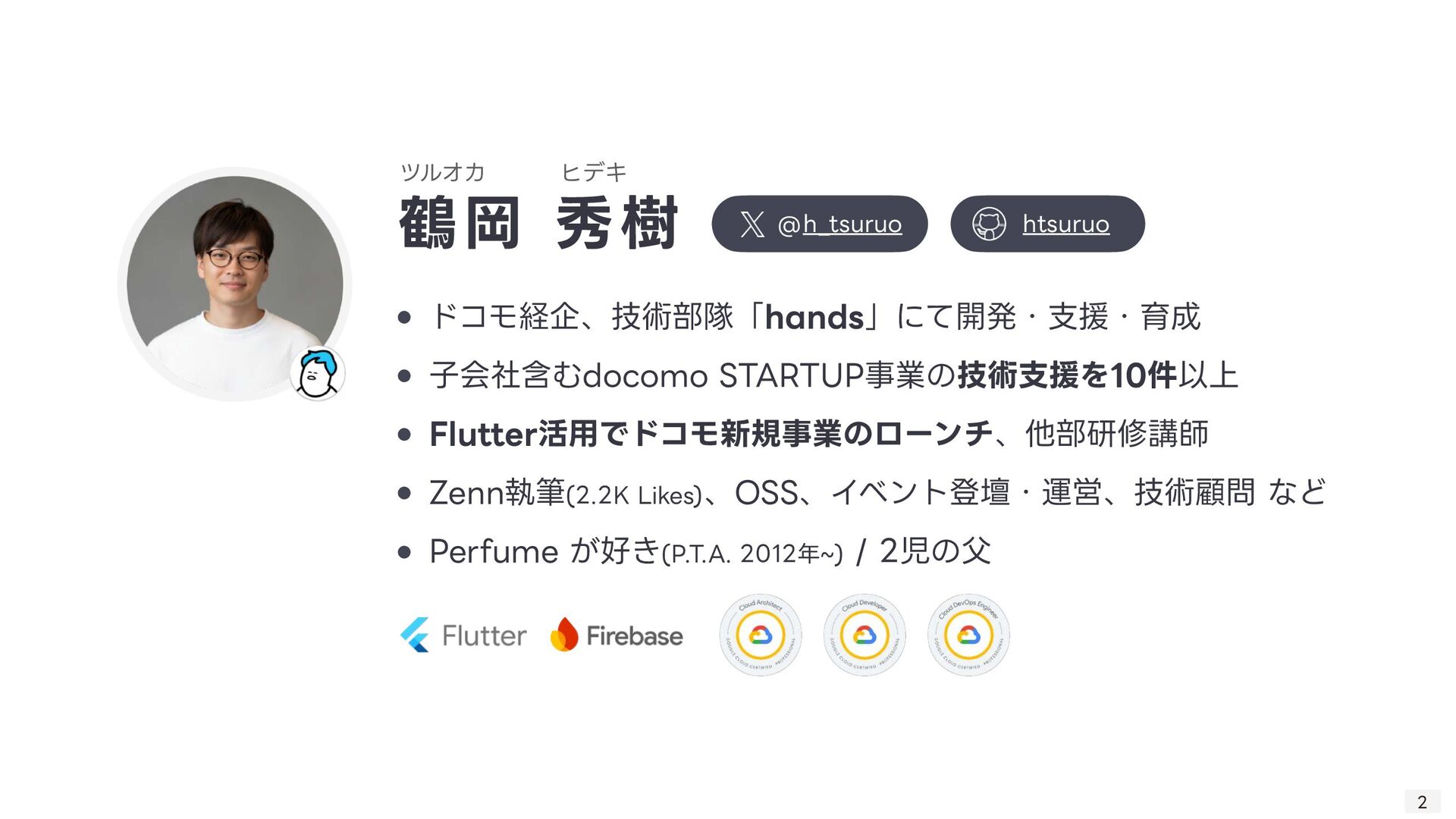 2 鶴岡 秀樹 • ドコモ経企、技術部隊「hands」にて開発・⽀援・育成 • ⼦会社含むdocomo STARTUP事業の技術⽀援を10件以上 • Flutter活⽤でドコモ新規事業のローンチ、他部研修講師