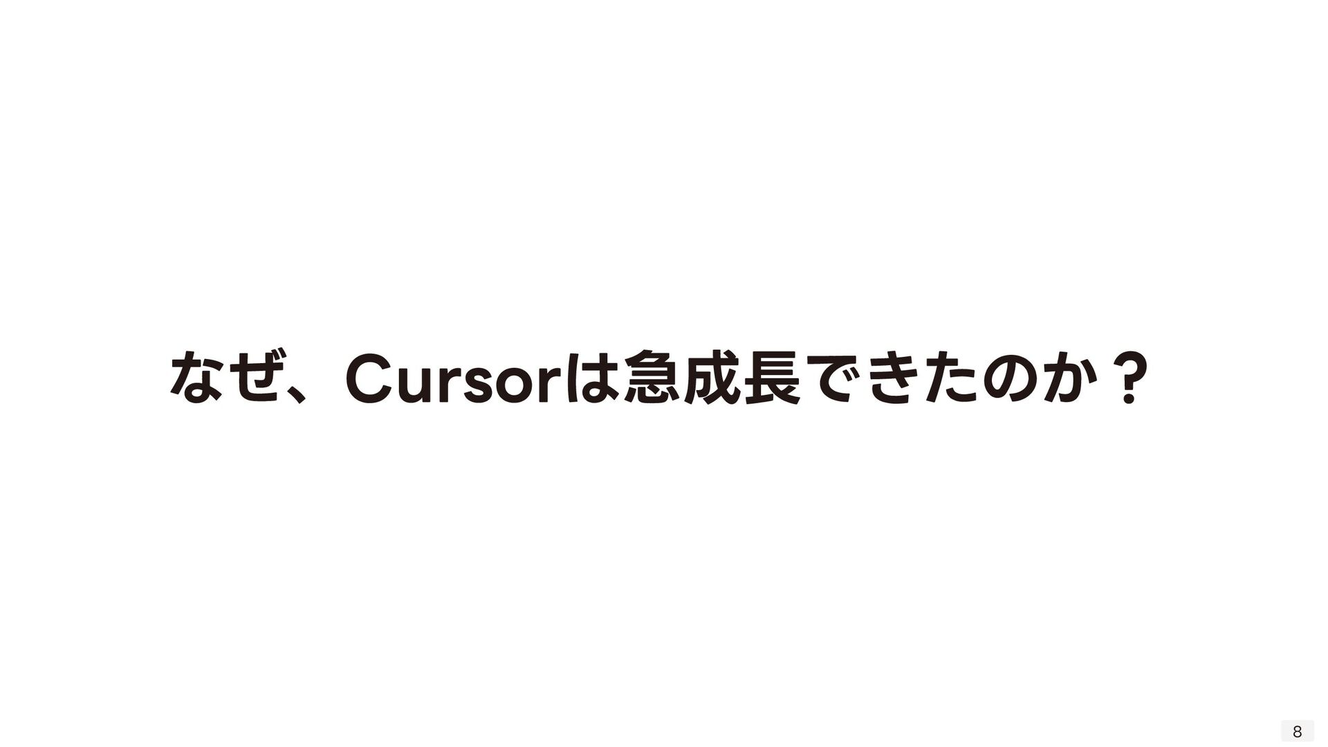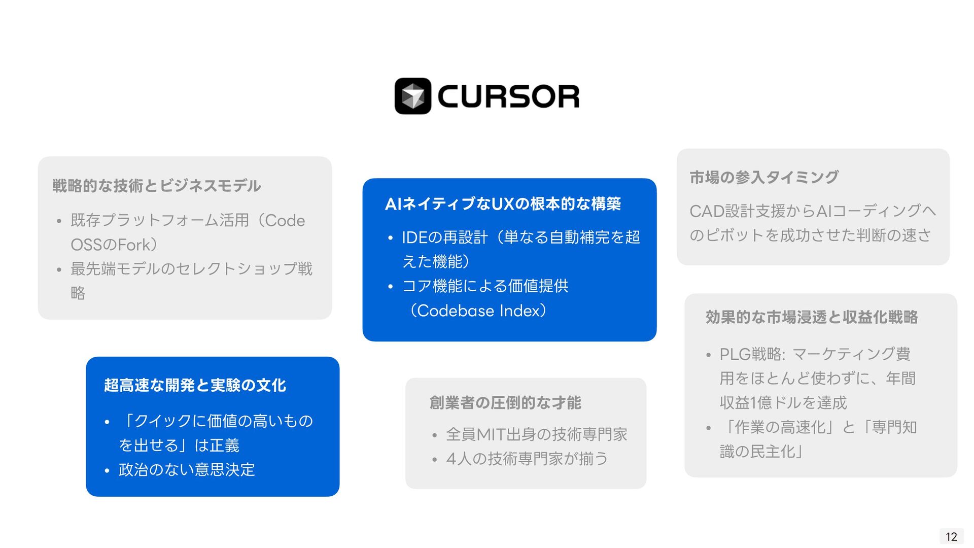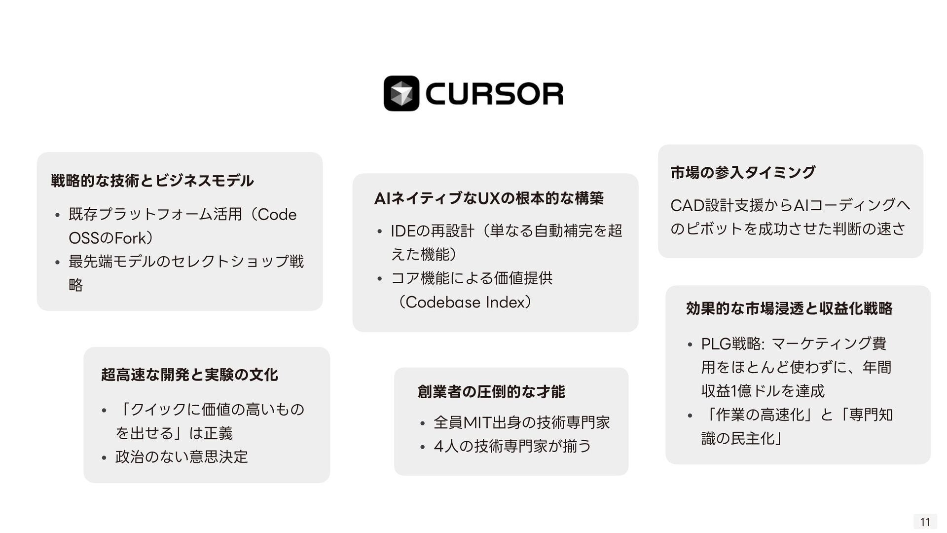 創業者の圧倒的な才能 市場の参⼊タイミング CAD設計⽀援からAIコーディングへ のピボットを成功させた判断の速さ • 「クイックに価値の⾼いもの を出せる」は正義 • 政治のない意思決定 • IDEの再設計(単なる⾃動補完を超 えた機能) • コア機能による価値提供 (Codebase Index) • 全員MIT出⾝の技術専⾨家 • 4⼈の技術専⾨家が揃う 効果的な市場浸透と収益化戦略 • PLG戦略: マーケティング費 ⽤をほとんど使わずに、年間 収益1億ドルを達成 • 「作業の⾼速化」と「専⾨知 識の⺠主化」