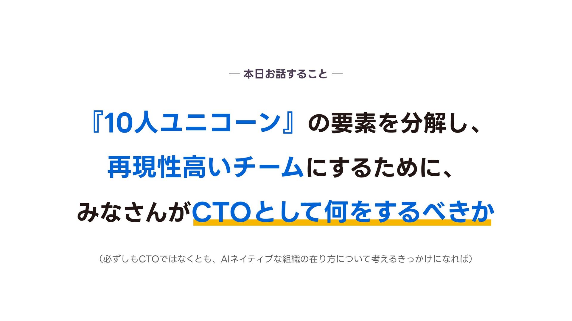 ─ 本⽇お話すること ─ (必ずしもCTOではなくとも、AIネイティブな組織の在り⽅について考えるきっかけになれば) 『10⼈ユニコーン』の要素を分解し、 再現性⾼いチームにするために、 みなさんがCTOとして何をするべきか
