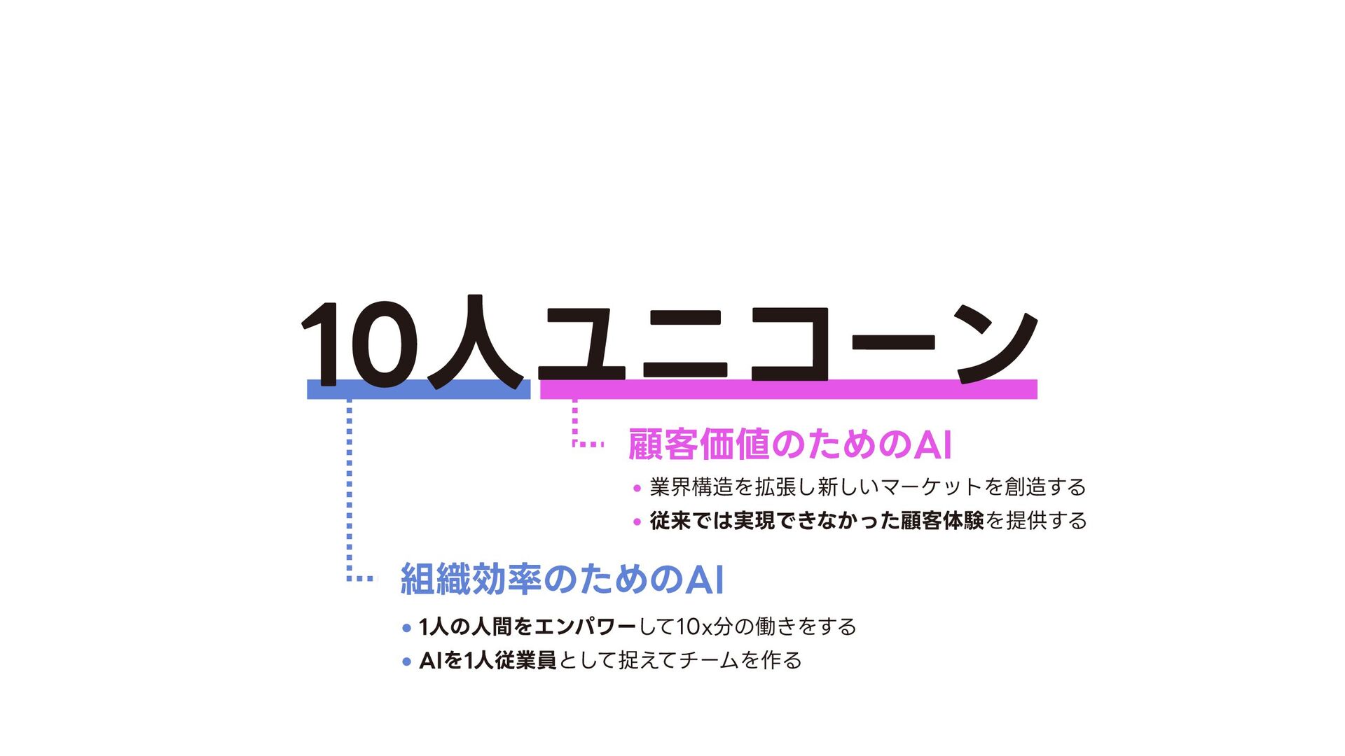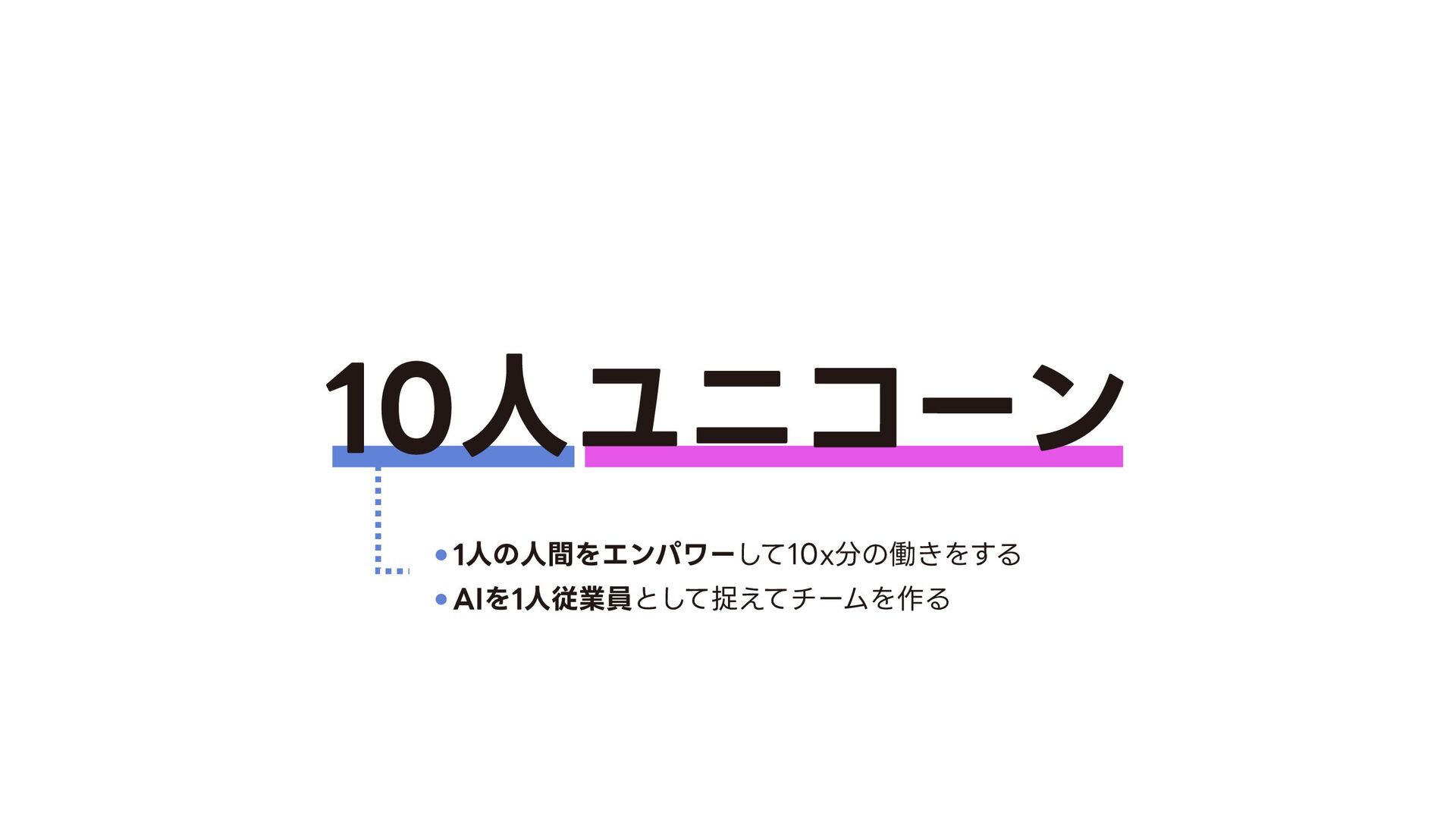 •1⼈の⼈間をエンパワーして10x分の働きをする •AIを1⼈従業員として捉えてチームを作る 10⼈ユニコーン