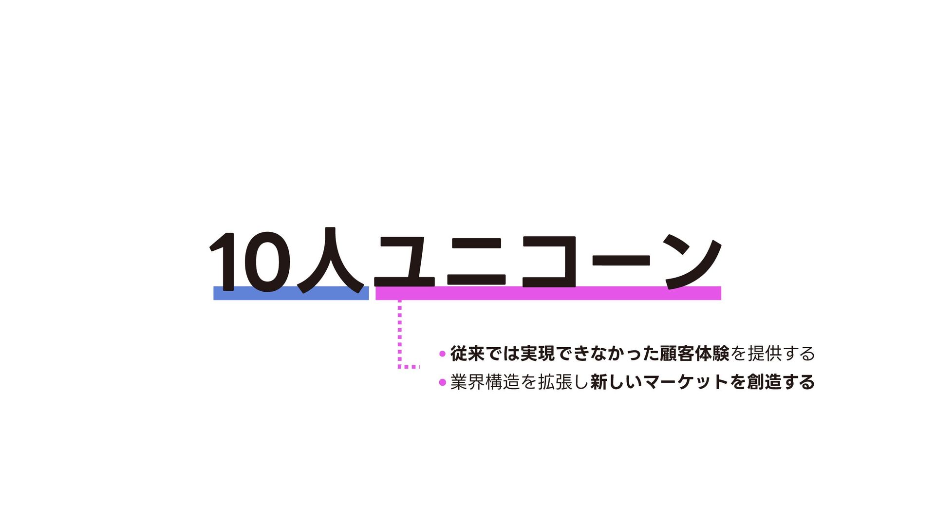 •従来では実現できなかった顧客体験を提供する •業界構造を拡張し新しいマーケットを創造する 10⼈ユニコーン
