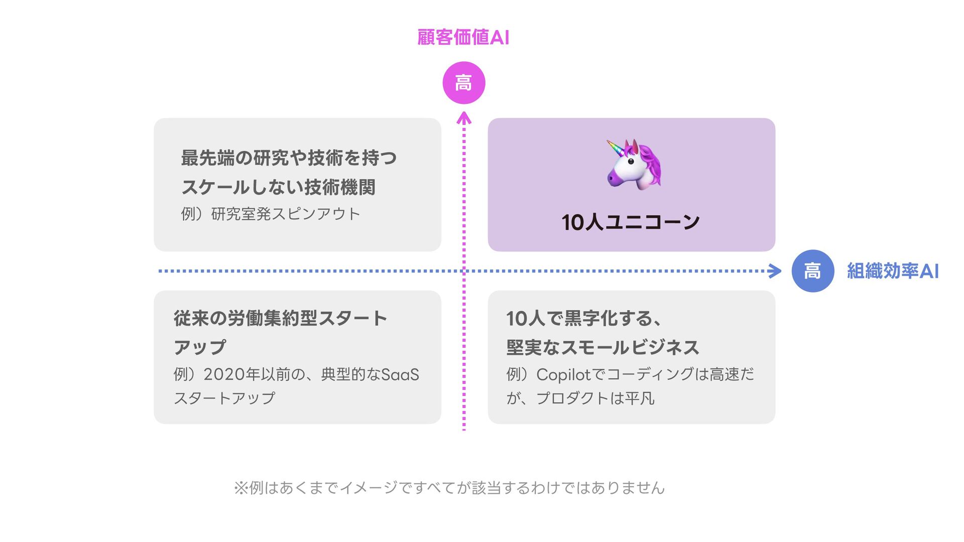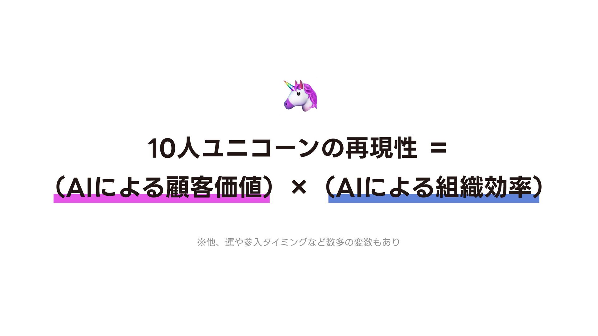 ※他、運や参⼊タイミングなど数多の変数もあり 10⼈ユニコーンの再現性 = (AIによる顧客価値)×(AIによる組織効率)