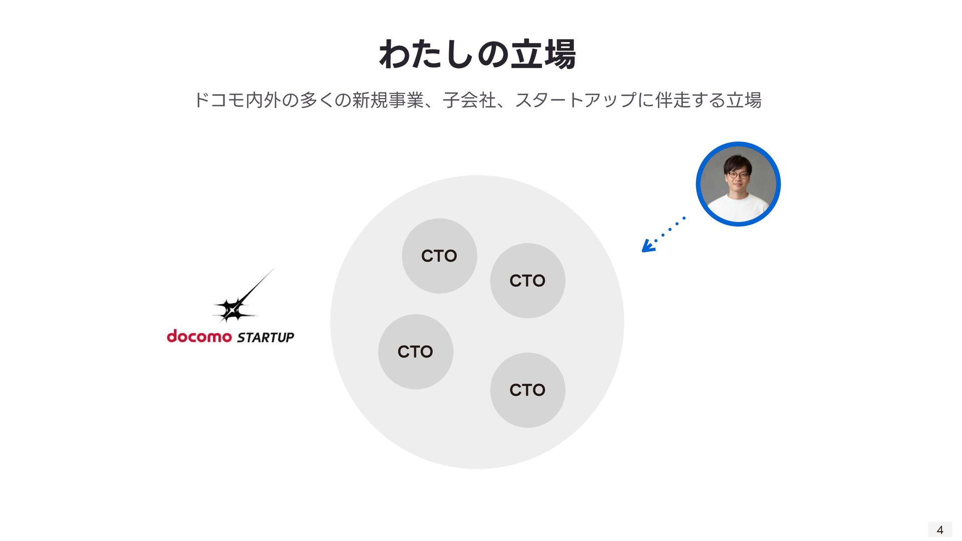 ドコモ内外の多くの新規事業、⼦会社、スタートアップに伴⾛する⽴場 わたしの⽴場 4 CTO CTO CTO CTO