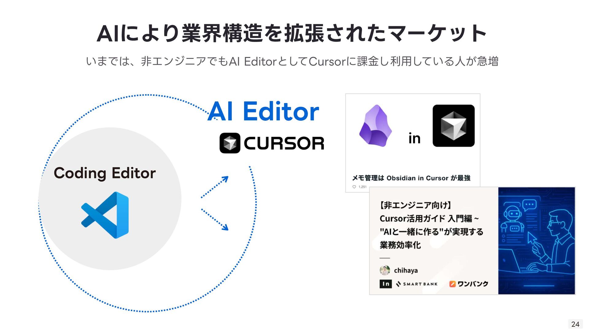 いまでは、⾮エンジニアでもAI EditorとしてCursorに課⾦し利⽤している⼈が急増 AIにより業界構造を拡張されたマーケット 24 Coding Editor AI Editor