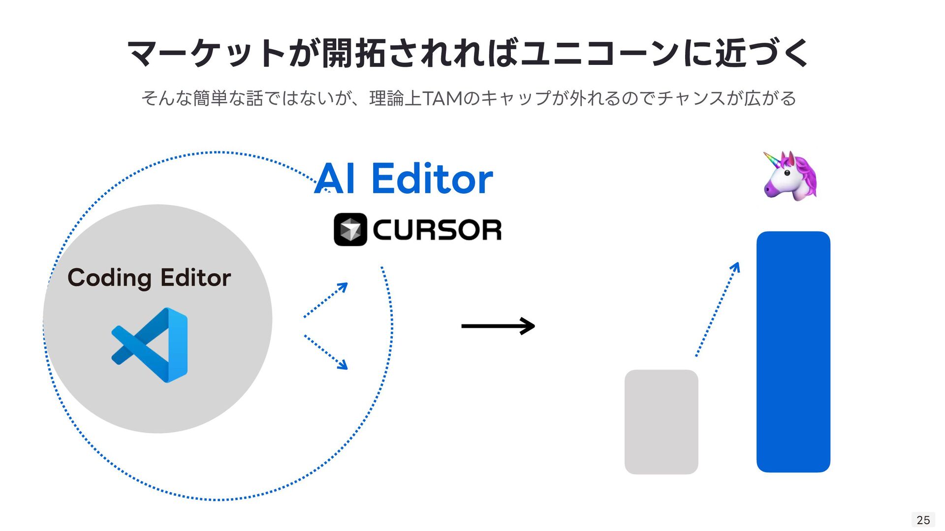 そんな簡単な話ではないが、理論上TAMのキャップが外れるのでチャンスが広がる マーケットが開拓されればユニコーンに近づく 25 Coding Editor AI Editor
