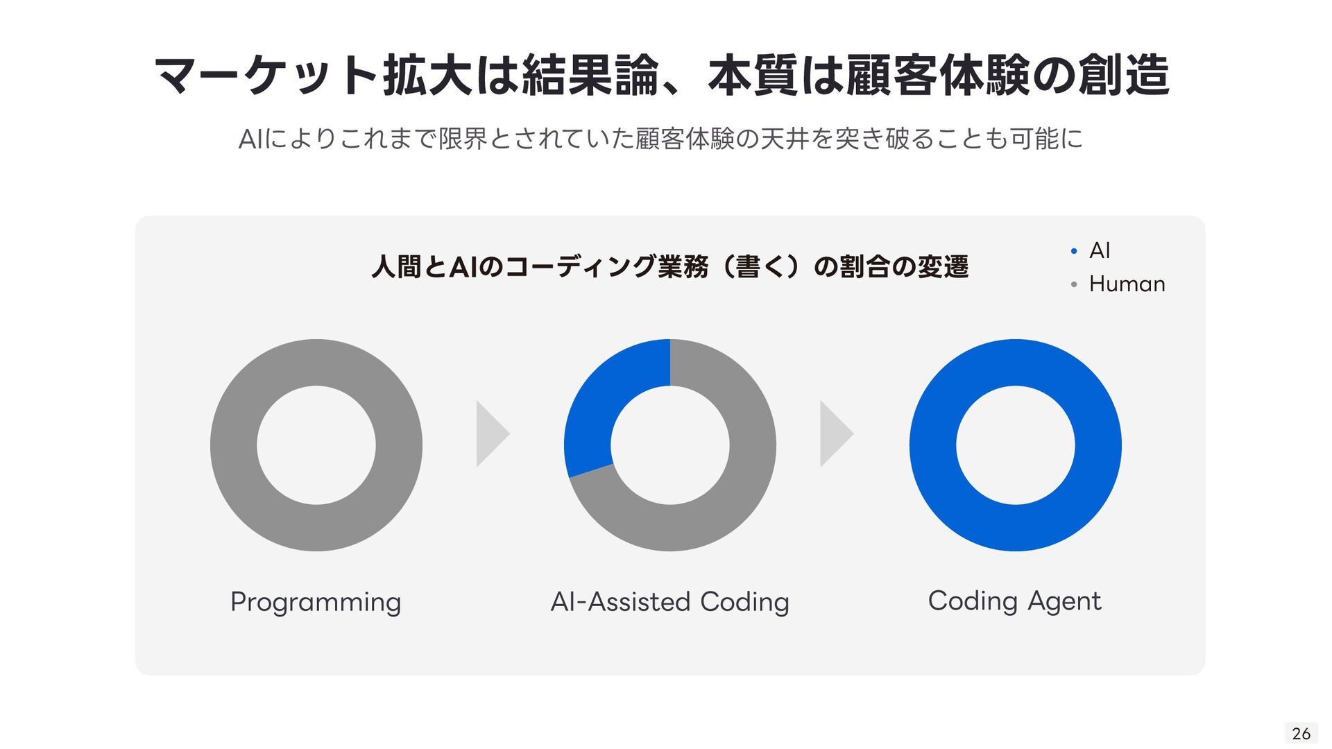 Coding Agent AIによりこれまで限界とされていた顧客体験の天井を突き破ることも可能に マーケット拡⼤は結果論、本質は顧客体験の創造 26 AI-Assisted Coding Programming ⼈間とAIのコーディング業務(書く)の割合の変遷 •