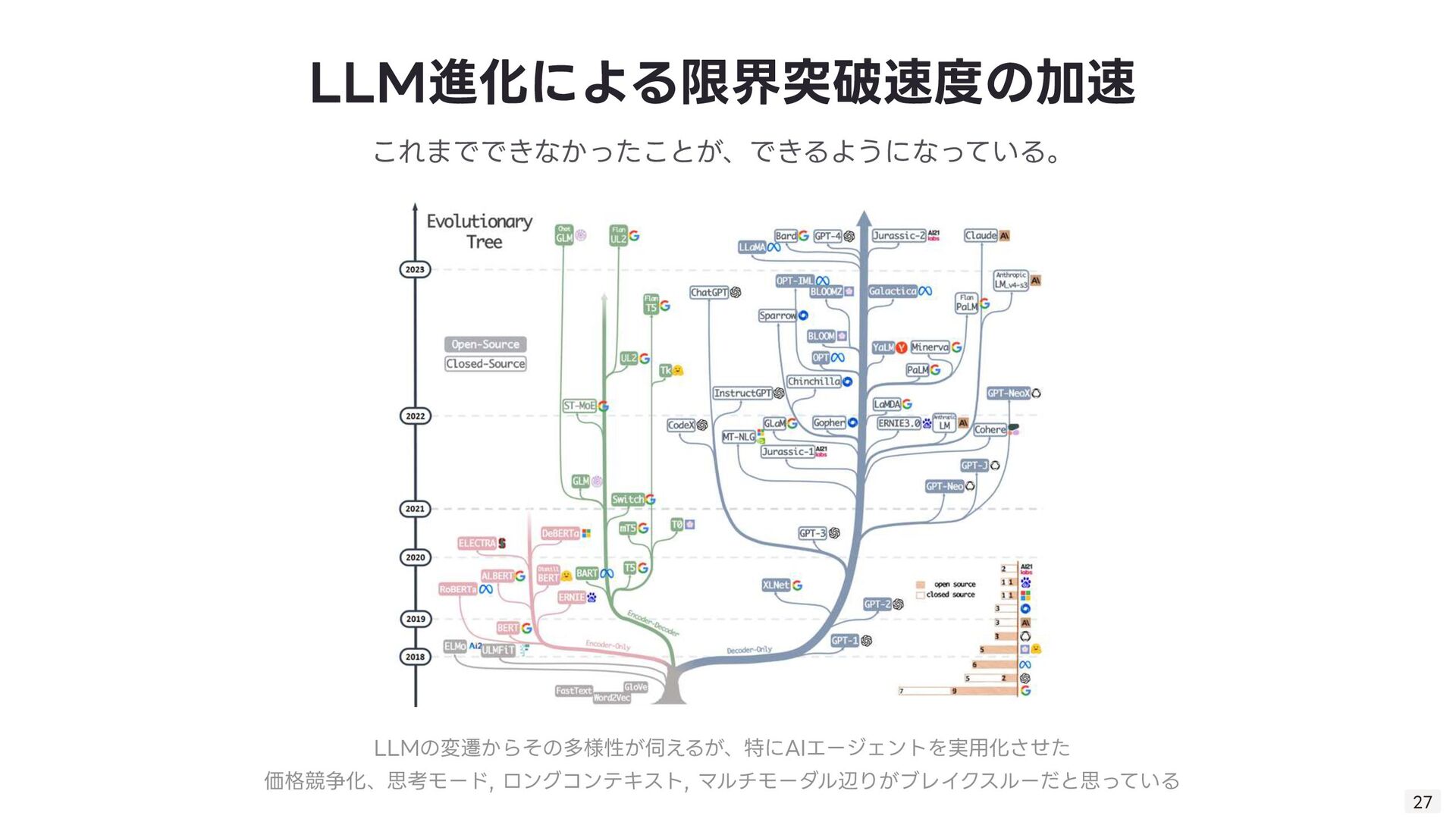 これまでできなかったことが、できるようになっている。 LLM進化による限界突破速度の加速 27 LLMの変遷からその多様性が伺えるが、特にAIエージェントを実⽤化させた 価格競争化、思考モード, ロングコンテキスト, マルチモーダル辺りがブレイクスルーだと思っている