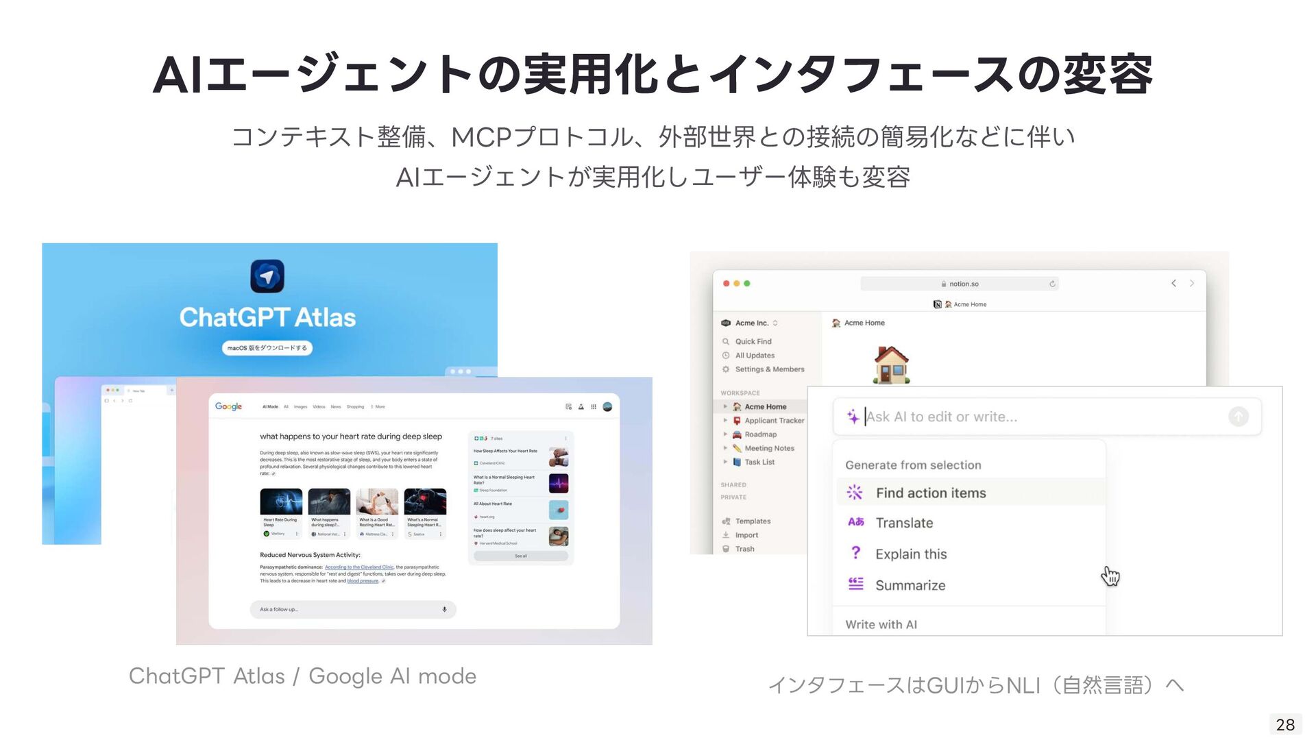 コンテキスト整備、MCPプロトコル、外部世界との接続の簡易化などに伴い AIエージェントが実⽤化しユーザー体験も変容 AIエージェントの実⽤化とインタフェースの変容 28 ChatGPT Atlas / Google AI mode