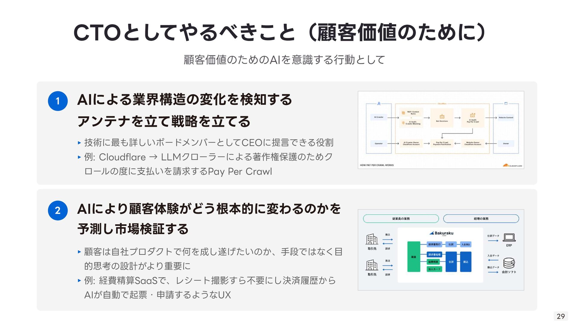 ‣ 例: 経費精算SaaSで、レシート撮影すら不要にし決済履歴から AIが⾃動で起票・申請するようなUX ‣ 技術に最も詳しいボードメンバーとしてCEOに提⾔できる役割 ‣ 例: Cloudflare → LLMクローラーによる著作権保護のためク ロールの度に⽀払いを請求するPay Per Crawl 1 2