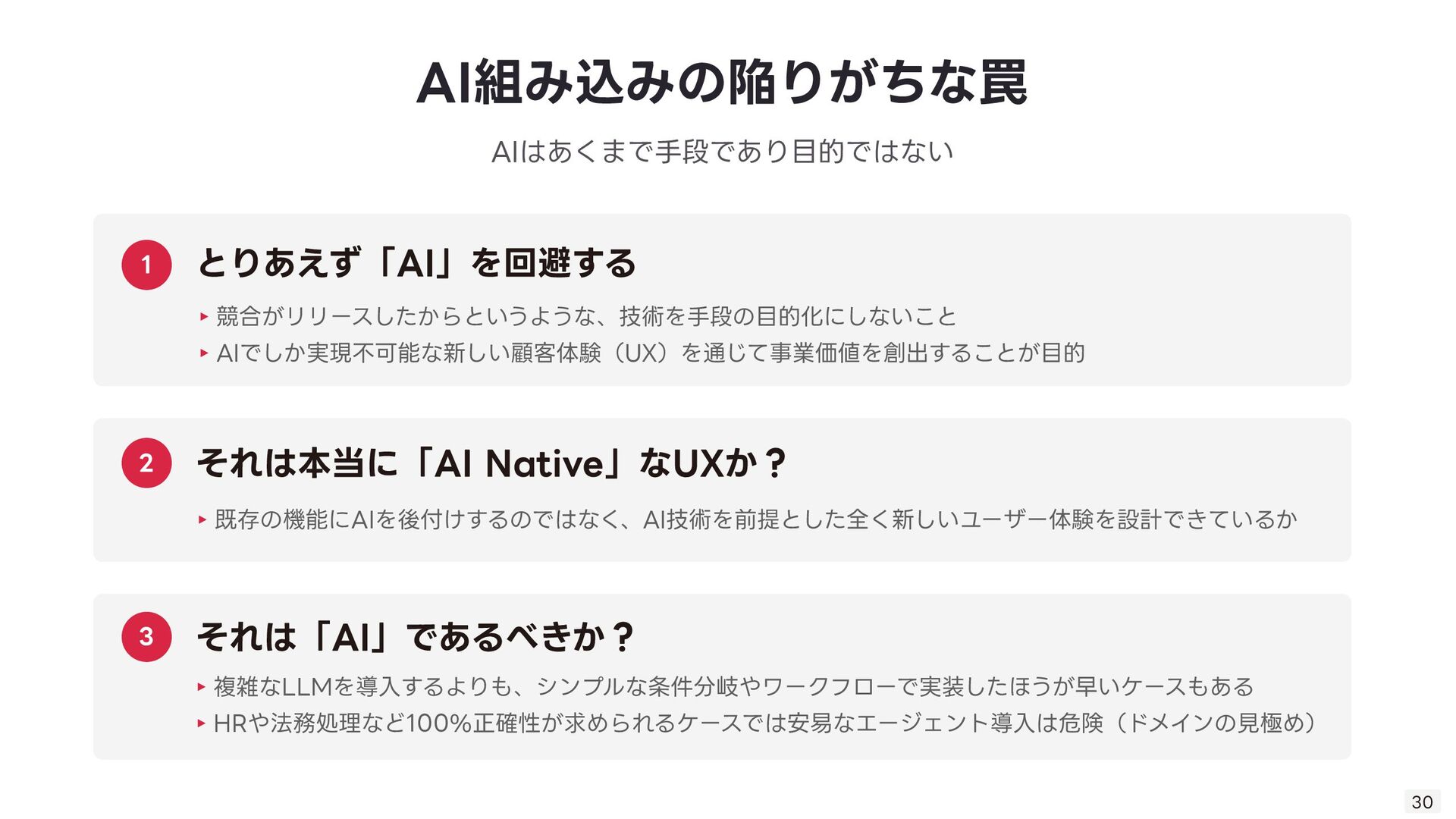AIでしか実現不可能な新しい顧客体験(UX)を通じて事業価値を創出することが⽬的 1 2 3 ‣ 既存の機能にAIを後付けするのではなく、AI技術を前提とした全く新しいユーザー体験を設計できているか ‣ 複雑なLLMを導⼊するよりも、シンプルな条件分岐やワークフローで実装したほうが早いケースもある ‣ HRや法務処理など100%正確性が求められるケースでは安易なエージェント導⼊は危険(ドメインの⾒極め)