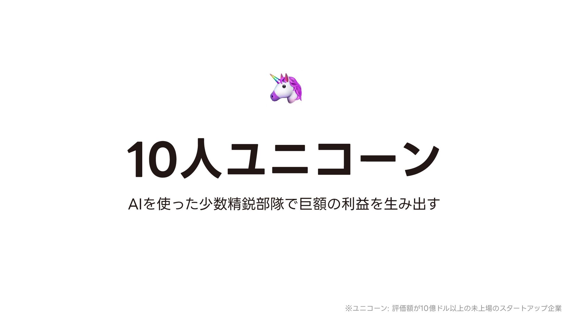 10⼈ユニコーン AIを使った少数精鋭部隊で巨額の利益を⽣み出す ※ユニコーン: 評価額が10億ドル以上の未上場のスタートアップ企業
