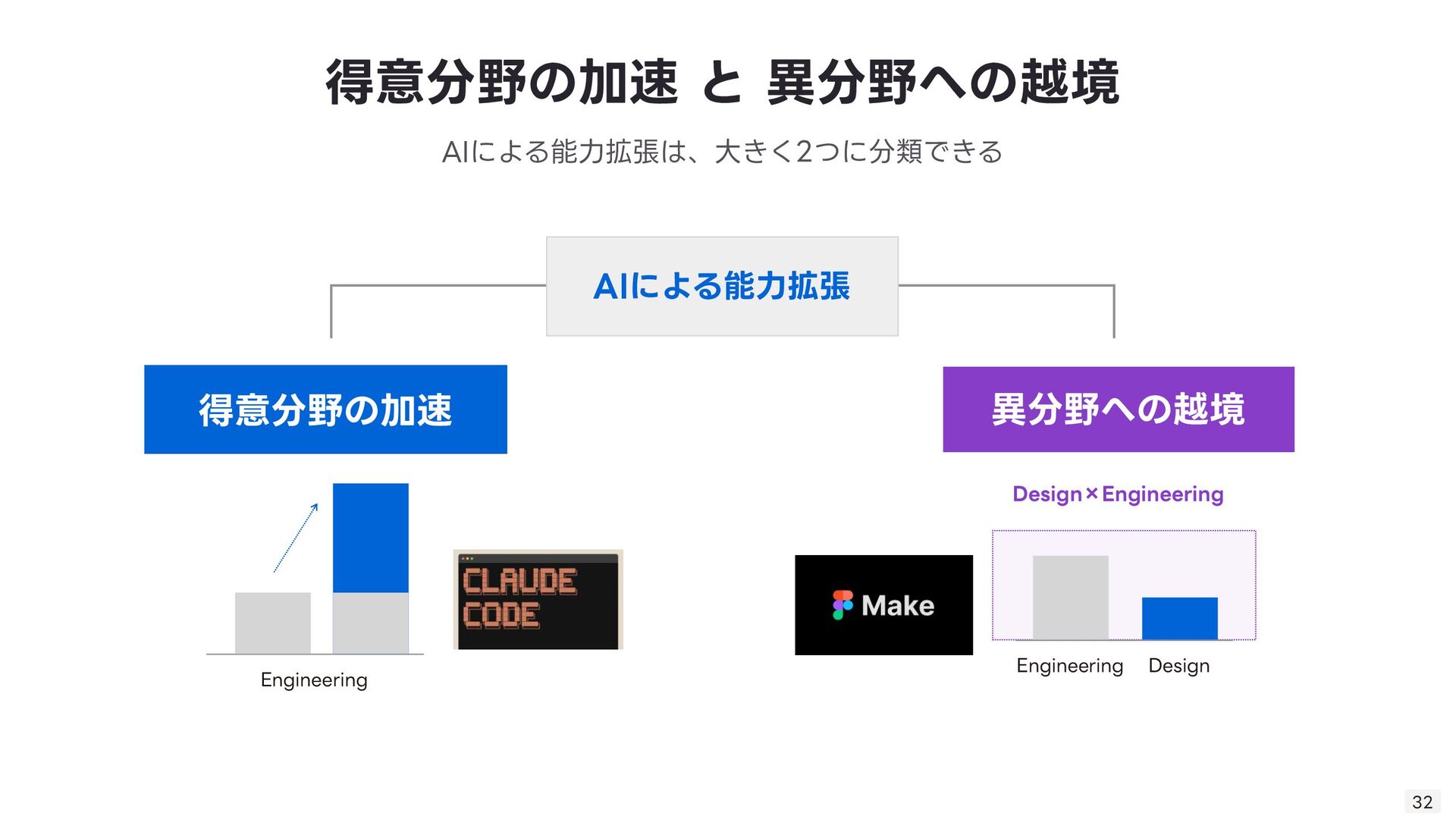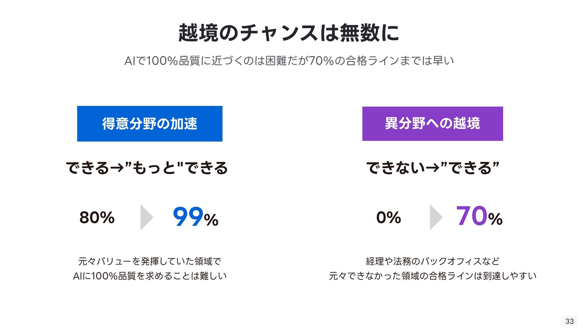AIによる能⼒拡張は、⼤きく2つに分類できる 得意分野の加速 と 異分野への越境 32 異分野への越境 得意分野の加速 Engineering Engineering Design