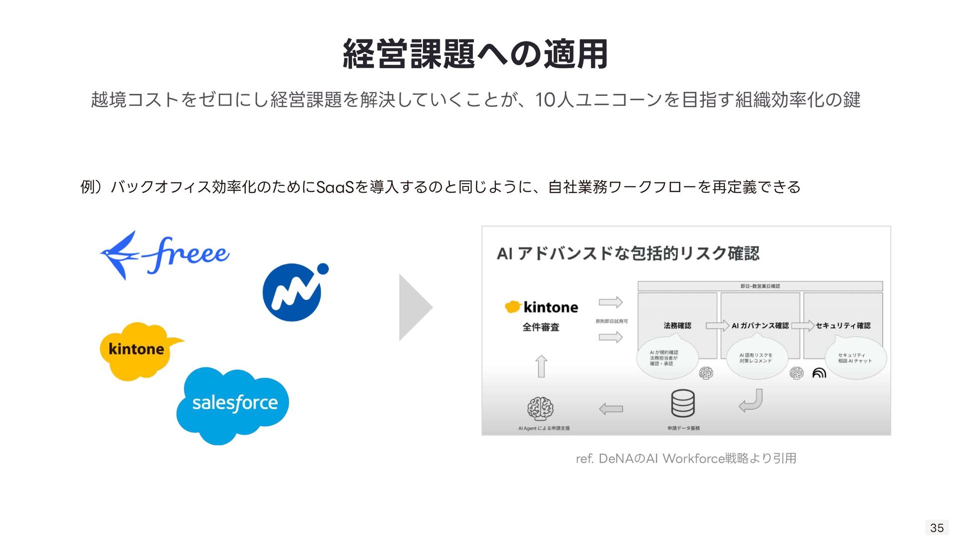 越境コストをゼロにし経営課題を解決していくことが、10⼈ユニコーンを⽬指す組織効率化の鍵 経営課題への適⽤ 35 例)バックオフィス効率化のためにSaaSを導⼊するのと同じように、⾃社業務ワークフローを再定義できる ref. DeNAのAI Workforce戦略より引⽤