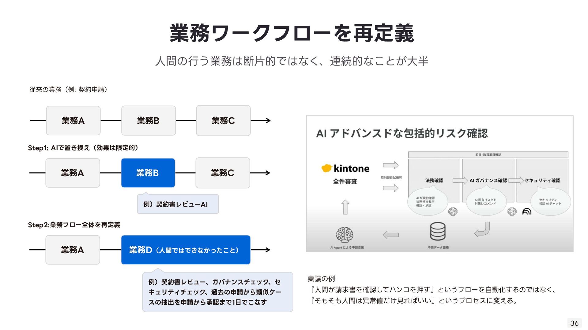 業務C 例)契約書レビューAI Step1: AIで置き換え(効果は限定的) 業務A 業務D(⼈間ではできなかったこと) Step2:業務フロー全体を再定義 例)契約書レビュー、ガバナンスチェック、セ キュリティチェック、過去の申請から類似ケー スの抽出を申請から承認まで1⽇でこなす 稟議の例: 『⼈間が請求書を確認してハンコを押す』というフローを⾃動化するのではなく、 『そもそも⼈間は異常値だけ⾒ればいい』というプロセスに変える。