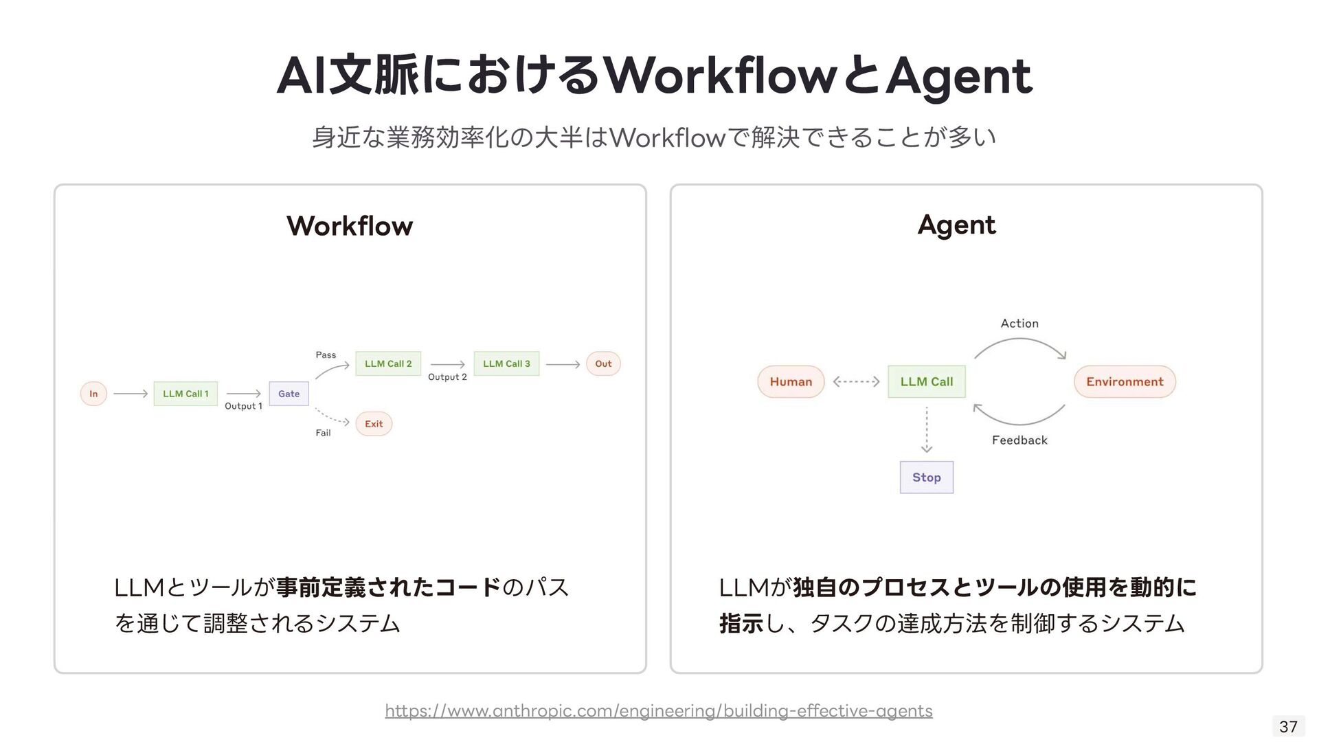 ⾝近な業務効率化の⼤半はWorkflowで解決できることが多い AI⽂脈におけるWorkflowとAgent 37 LLMとツールが事前定義されたコードのパス を通じて調整されるシステム LLMが独⾃のプロセスとツールの使⽤を動的に 指⽰し、タスクの達成⽅法を制御するシステム Workflow Agent https://www.anthropic.com/engineering/building-effective-agents