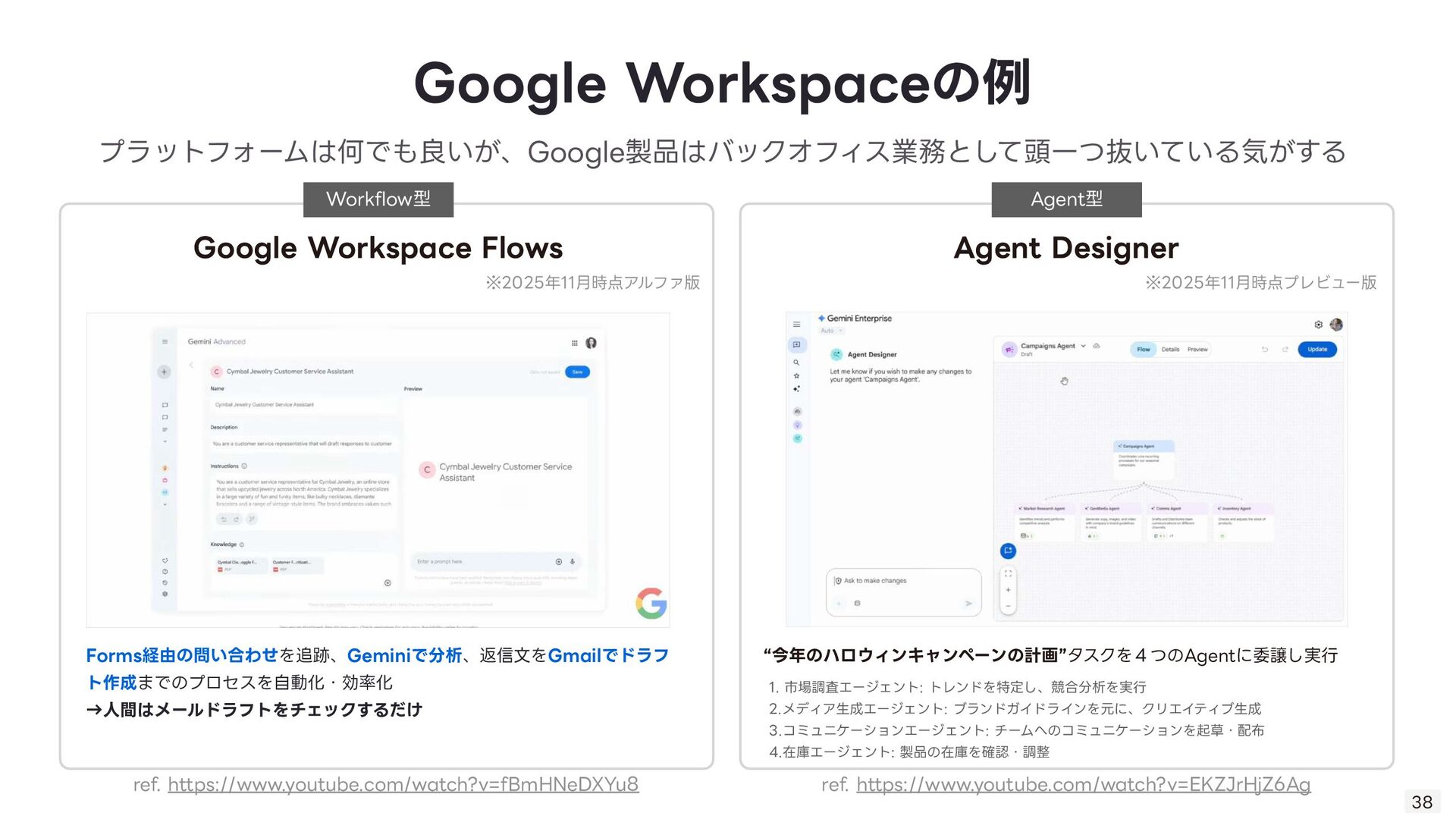 ※2025年11⽉時点アルファ版 Forms経由の問い合わせを追跡、Geminiで分析、返信⽂をGmailでドラフ ト作成までのプロセスを⾃動化・効率化 →⼈間はメールドラフトをチェックするだけ ref. https://www.youtube.com/watch?v=fBmHNeDXYu8 ※2025年11⽉時点プレビュー版 1. 市場調査エージェント: トレンドを特定し、競合分析を実⾏ 2.メディア⽣成エージェント: ブランドガイドラインを元に、クリエイティブ⽣成 3.コミュニケーションエージェント: チームへのコミュニケーションを起草・配布 4.在庫エージェント: 製品の在庫を確認・調整 “今年のハロウィンキャンペーンの計画”タスクを4つのAgentに委譲し実⾏ Agent型 ref. https://www.youtube.com/watch?v=EKZJrHjZ6Ag
