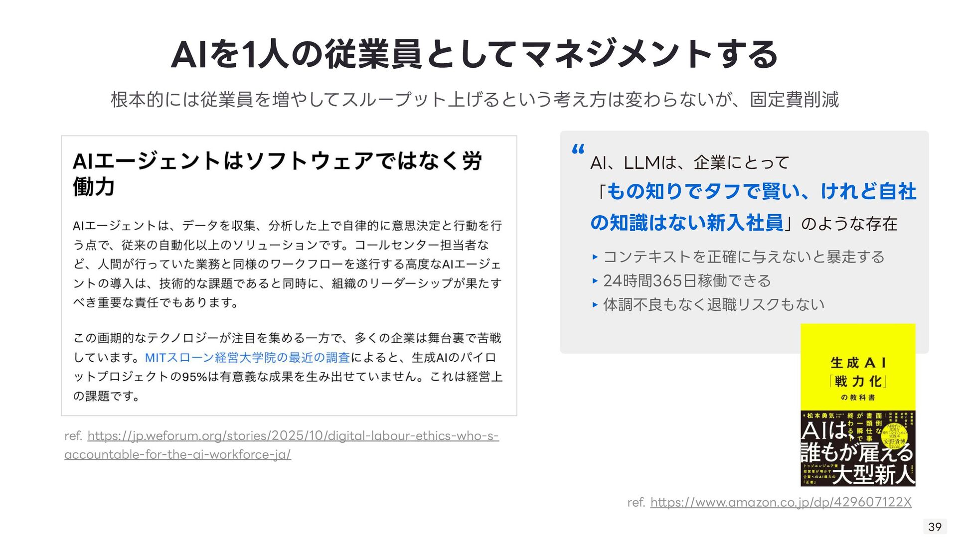 根本的には従業員を増やしてスループット上げるという考え⽅は変わらないが、固定費削減 AIを1⼈の従業員としてマネジメントする 39 ref. https://www.amazon.co.jp/dp/429607122X AI、LLMは、企業にとって 「もの知りでタフで賢い、けれど⾃社 の知識はない新⼊社員」のような存在 “ ‣