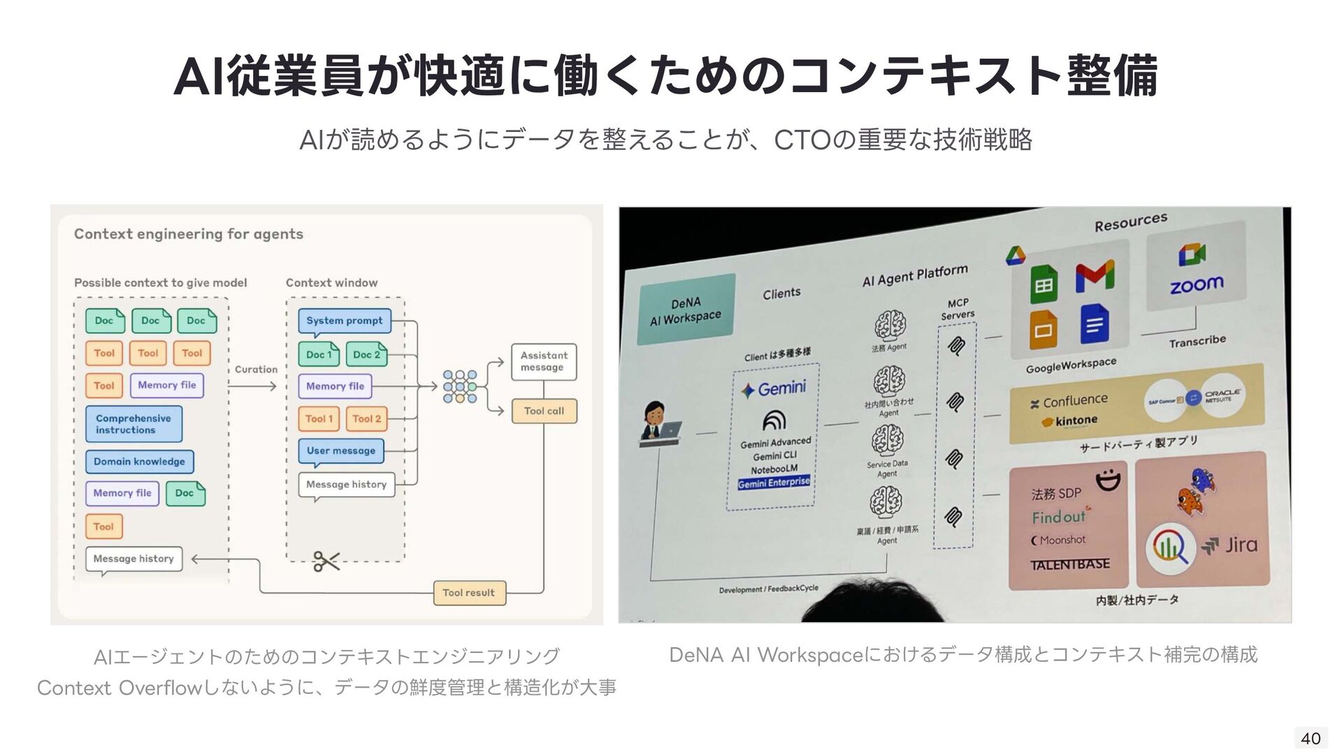 AIが読めるようにデータを整えることが、CTOの重要な技術戦略 AI従業員が快適に働くためのコンテキスト整備 40 AIエージェントのためのコンテキストエンジニアリング Context Overflowしないように、データの鮮度管理と構造化が⼤事 DeNA AI Workspaceにおけるデータ構成とコンテキスト補完の構成
