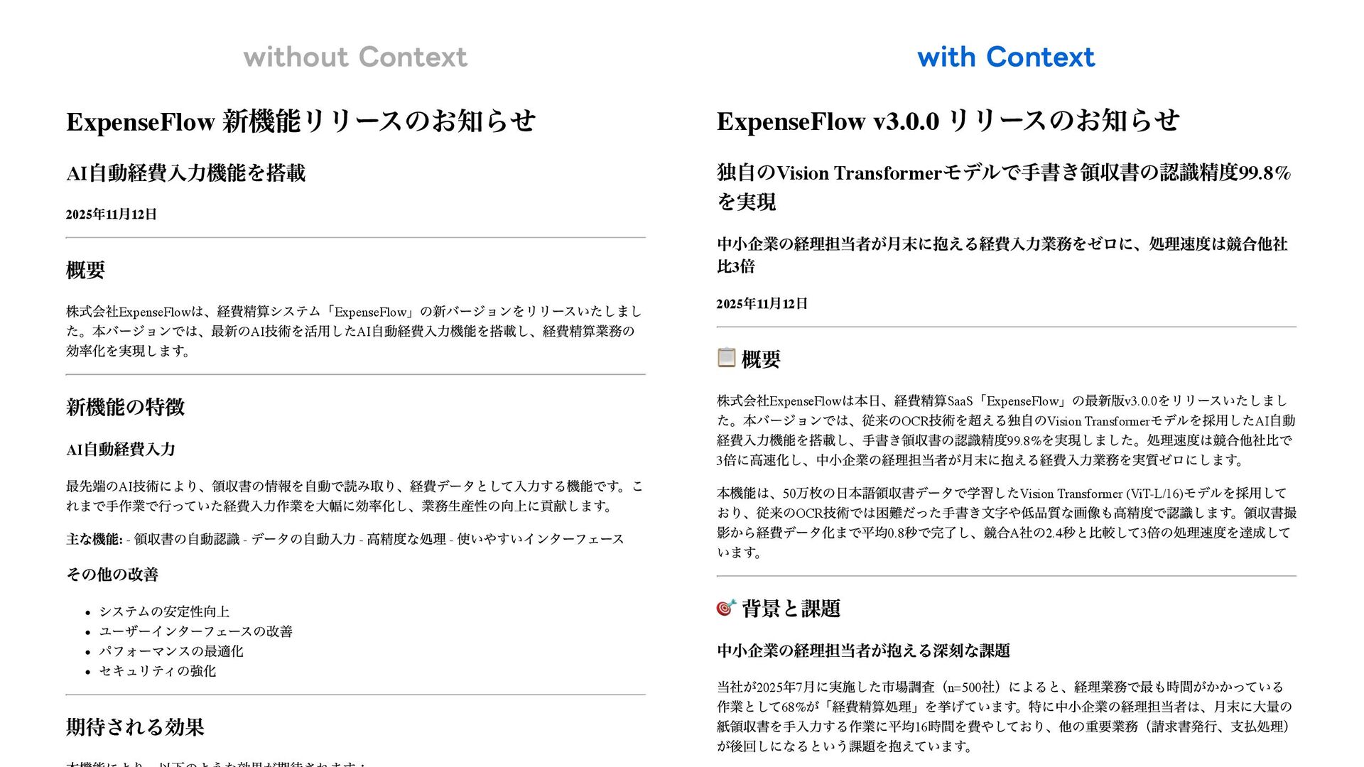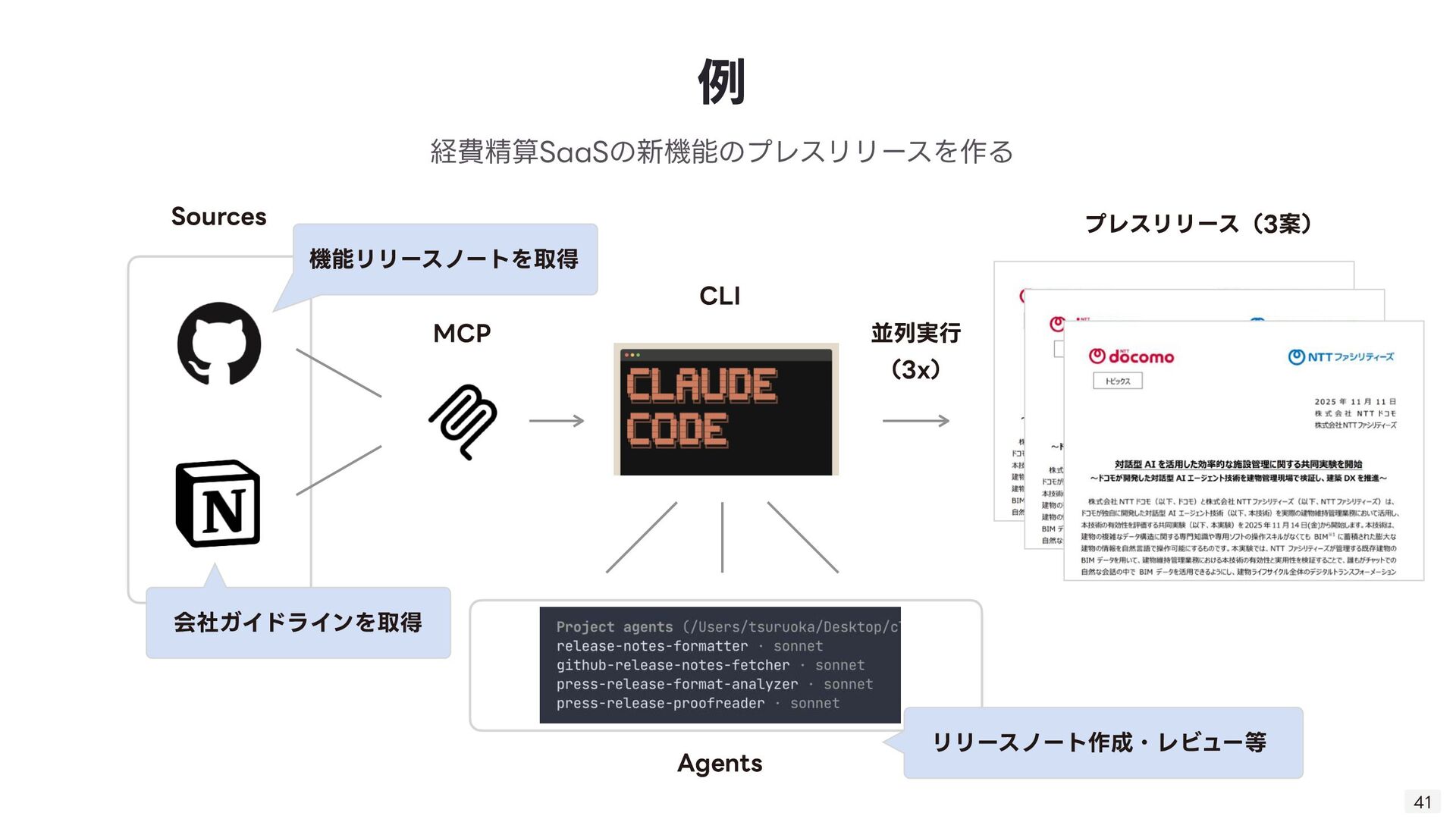 経費精算SaaSの新機能のプレスリリースを作る 例 41 Sources Agents MCP プレスリリース(3案) CLI 機能リリースノートを取得 会社ガイドラインを取得