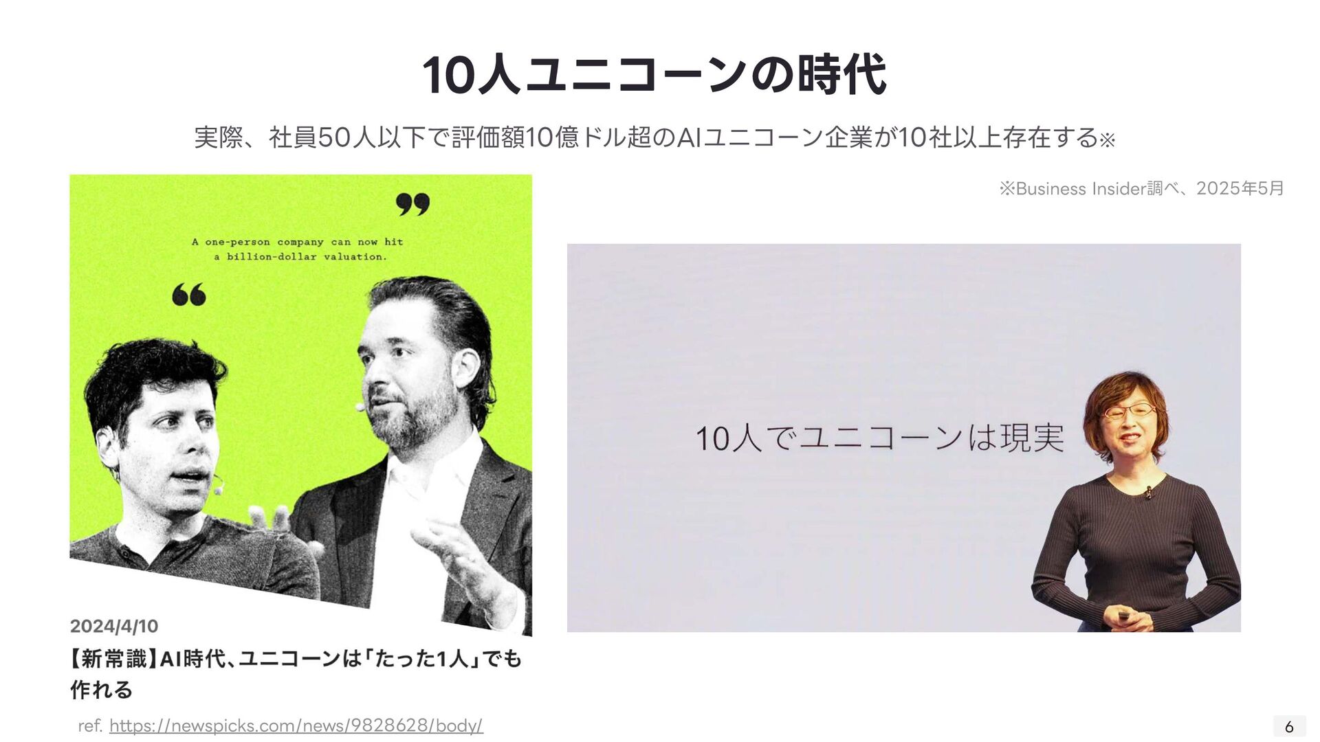 実際、社員50⼈以下で評価額10億ドル超のAIユニコーン企業が10社以上存在する※ 10⼈ユニコーンの時代 6 ※Business Insider調べ、2025年5⽉ ref. https://newspicks.com/news/9828628/body/