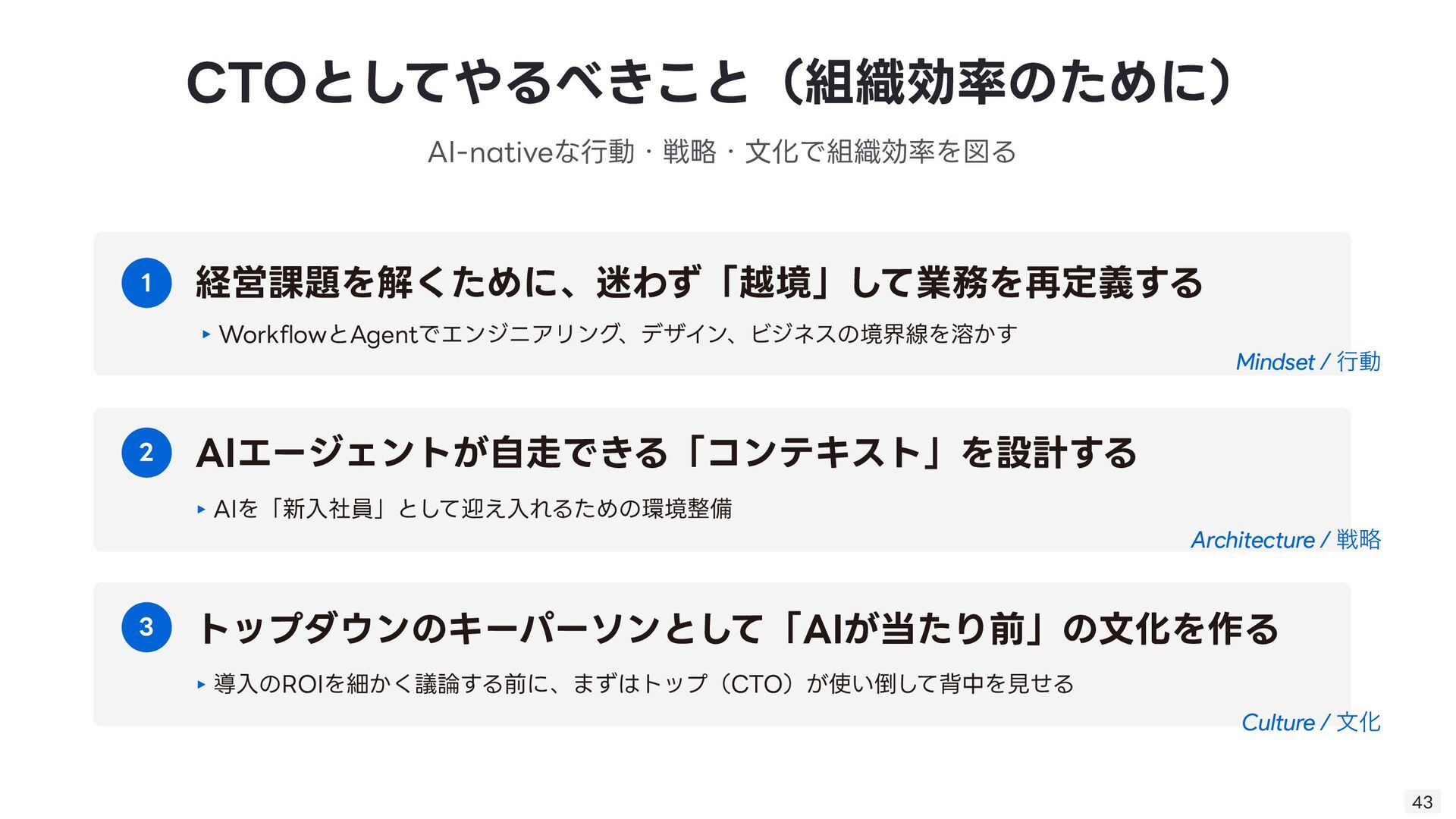 AI-nativeな⾏動・戦略・⽂化で組織効率を図る CTOとしてやるべきこと(組織効率のために) 43 ‣ AIを「新⼊社員」として迎え⼊れるための環境整備 1 2 経営課題を解くために、迷わず「越境」して業務を再定義する AIエージェントが⾃⾛できる「コンテキスト」を設計する ‣