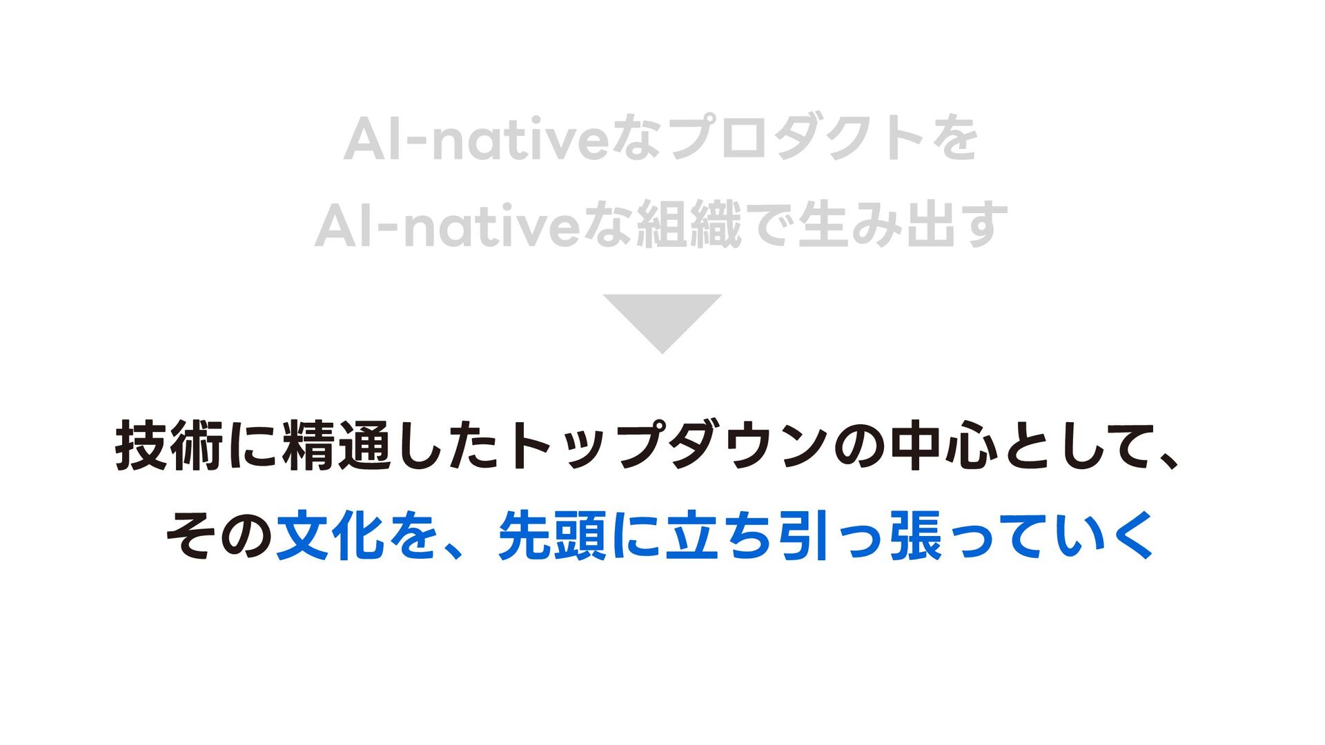 AI-nativeなプロダクトを AI-nativeな組織で⽣み出す 技術に精通したトップダウンの中⼼として、 その⽂化を、先頭に⽴ち引っ張っていく
