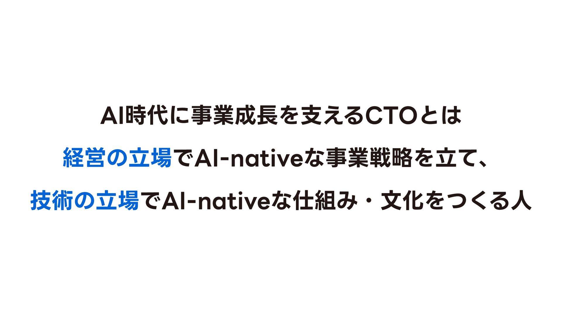 AI時代に事業成⻑を⽀えるCTOとは 経営の⽴場でAI-nativeな事業戦略を⽴て、 技術の⽴場でAI-nativeな仕組み・⽂化をつくる⼈