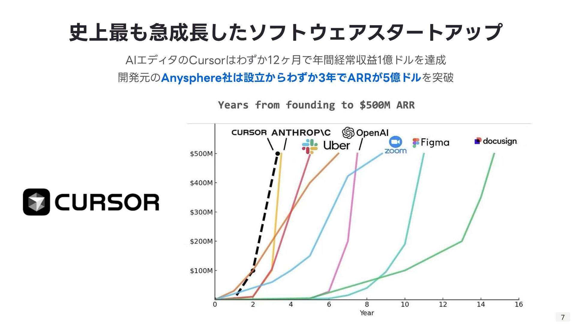 AIエディタのCursorはわずか12ヶ⽉で年間経常収益1億ドルを達成 開発元のAnysphere社は設⽴からわずか3年でARRが5億ドルを突破 史上最も急成⻑したソフトウェアスタートアップ 7