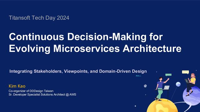 Currently, I am a Senior Solutions Architect at AWS Taiwan, focusing on the development of architect competencies, business requirements alignment, and the design and implementation of solutions. I am particularly committed to enhancing the value of IT professionals. Additionally, I am one of the founders of the Domain-Driven Design (DDD) Taiwan Community, dedicated to fostering socio-technical collaboration among technical professionals. My mission is to promote cross-group collaboration and co-creation in large-scale business system transformations. I advocate for enterprises to leverage Domain-Driven Design (DDD) and efficient cloud services to build tailored system solutions that address real business challenges.