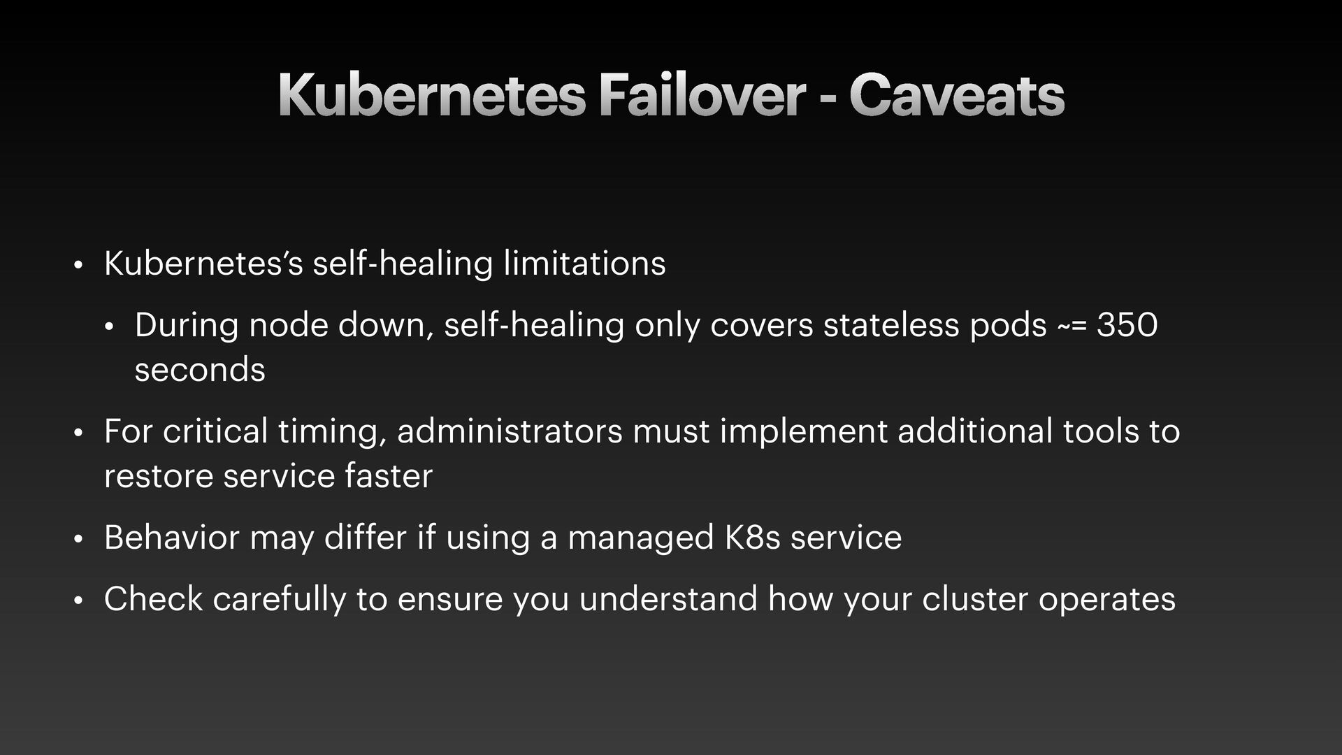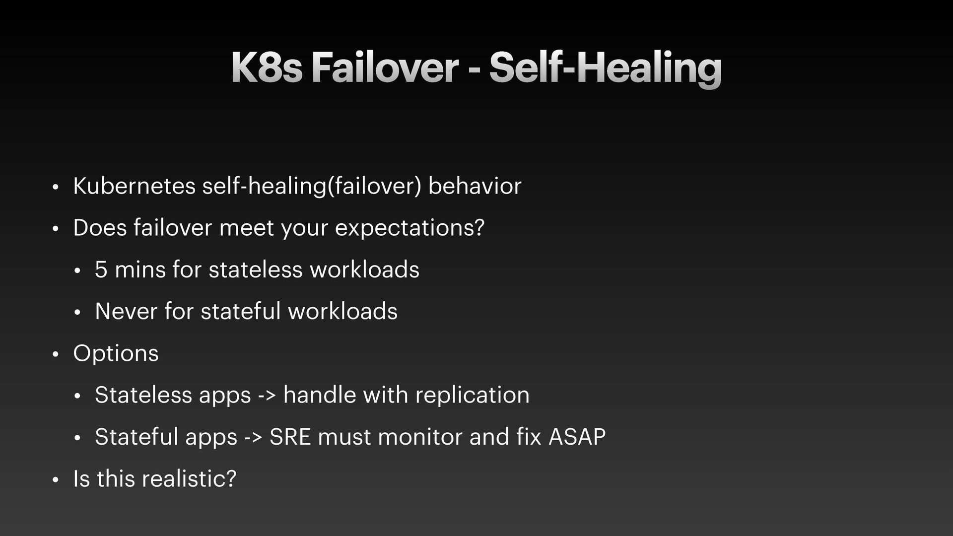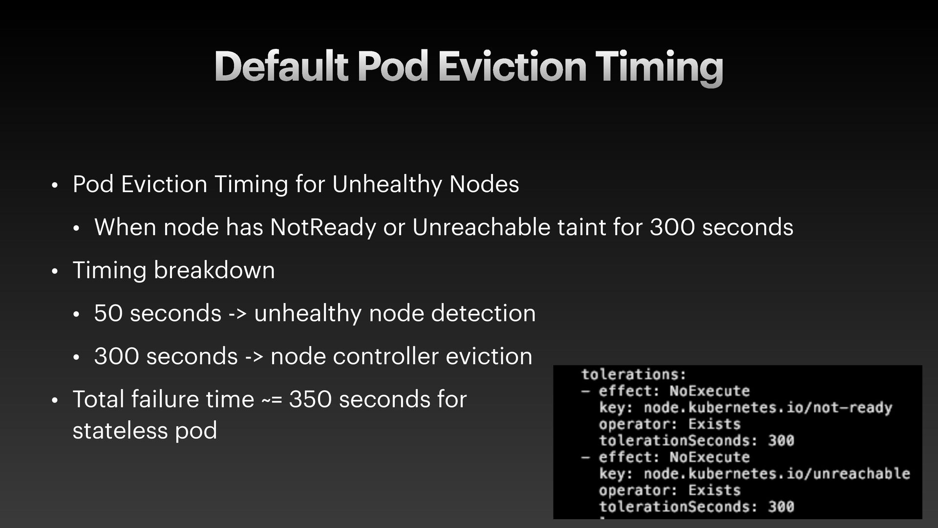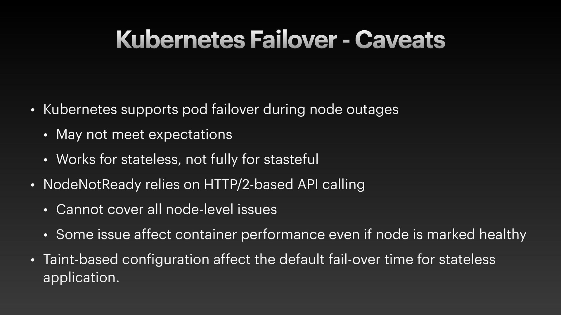 The presentation slides by HungWei Chiu provide an in-depth operational discussion of Kubernetes self-healing and failover design, particularly focusing on the differences between stateless and stateful applications. The source explains that stateless pods will eventually be redeployed following a node failure, with a total recovery time of approximately 350 seconds by default, determined by node health detection (50 seconds) and pod eviction timeouts (300 seconds). Conversely, stateful pods are not automatically redeployed upon node failure, requiring manual intervention due to challenges like persistent volume unmounting. Key factors discussed for failover include the time to declare a node unhealthy using Kubelet lease objects and the time until pods are evicted using taints and tolerations. The source also introduces the OutOfServiceTaint as a manual solution to accelerate the recovery of StatefulSets by reducing the default six-minute volume unmount timeout during node downtime.