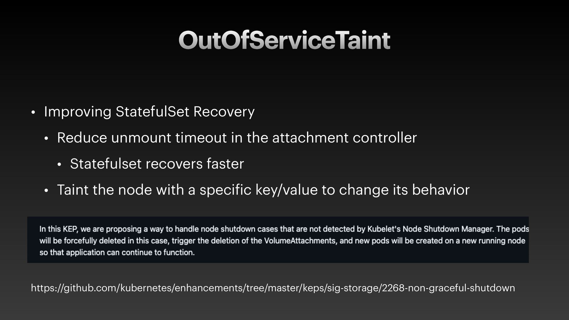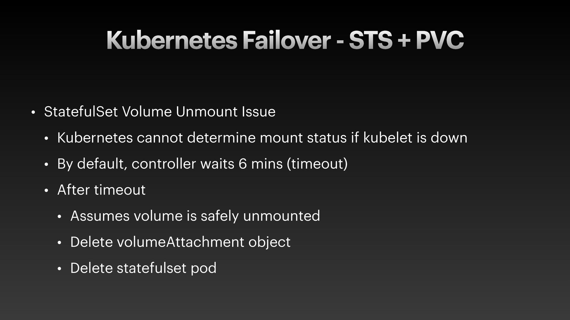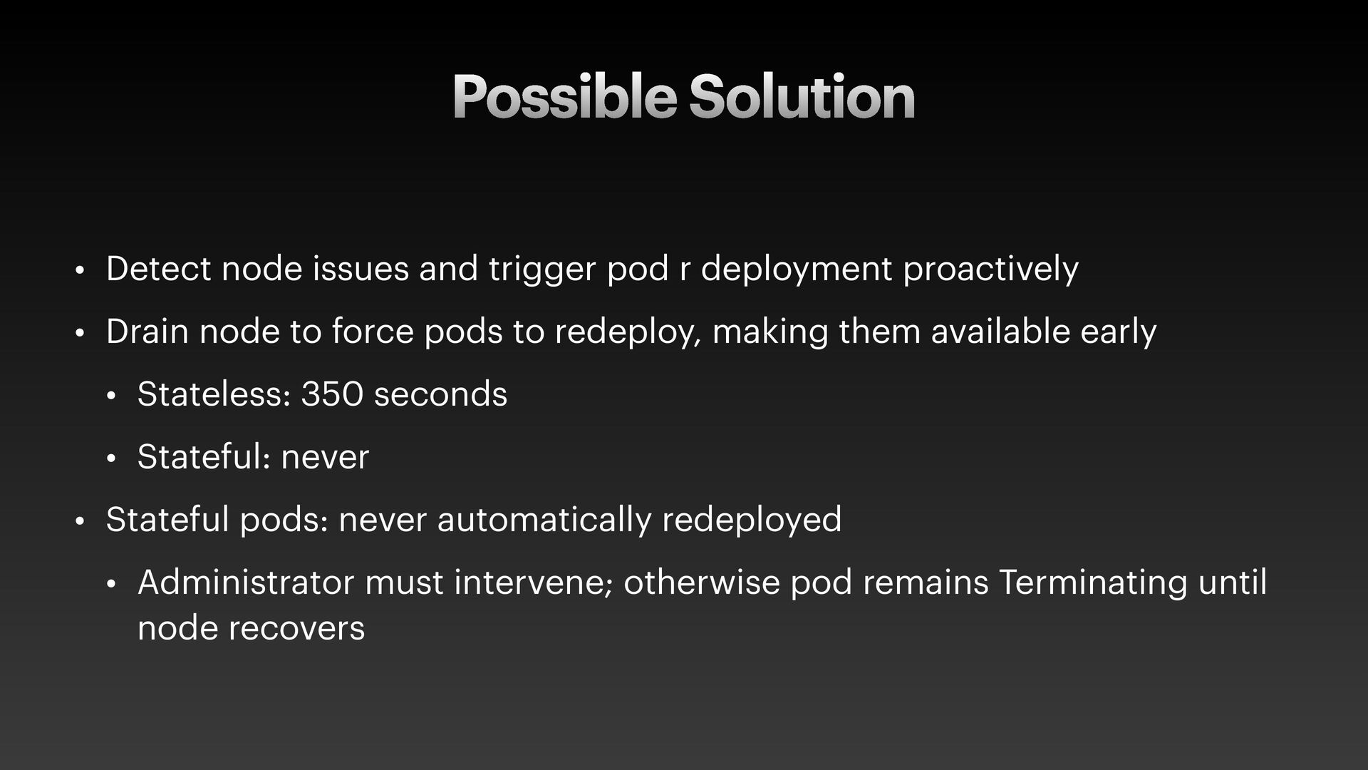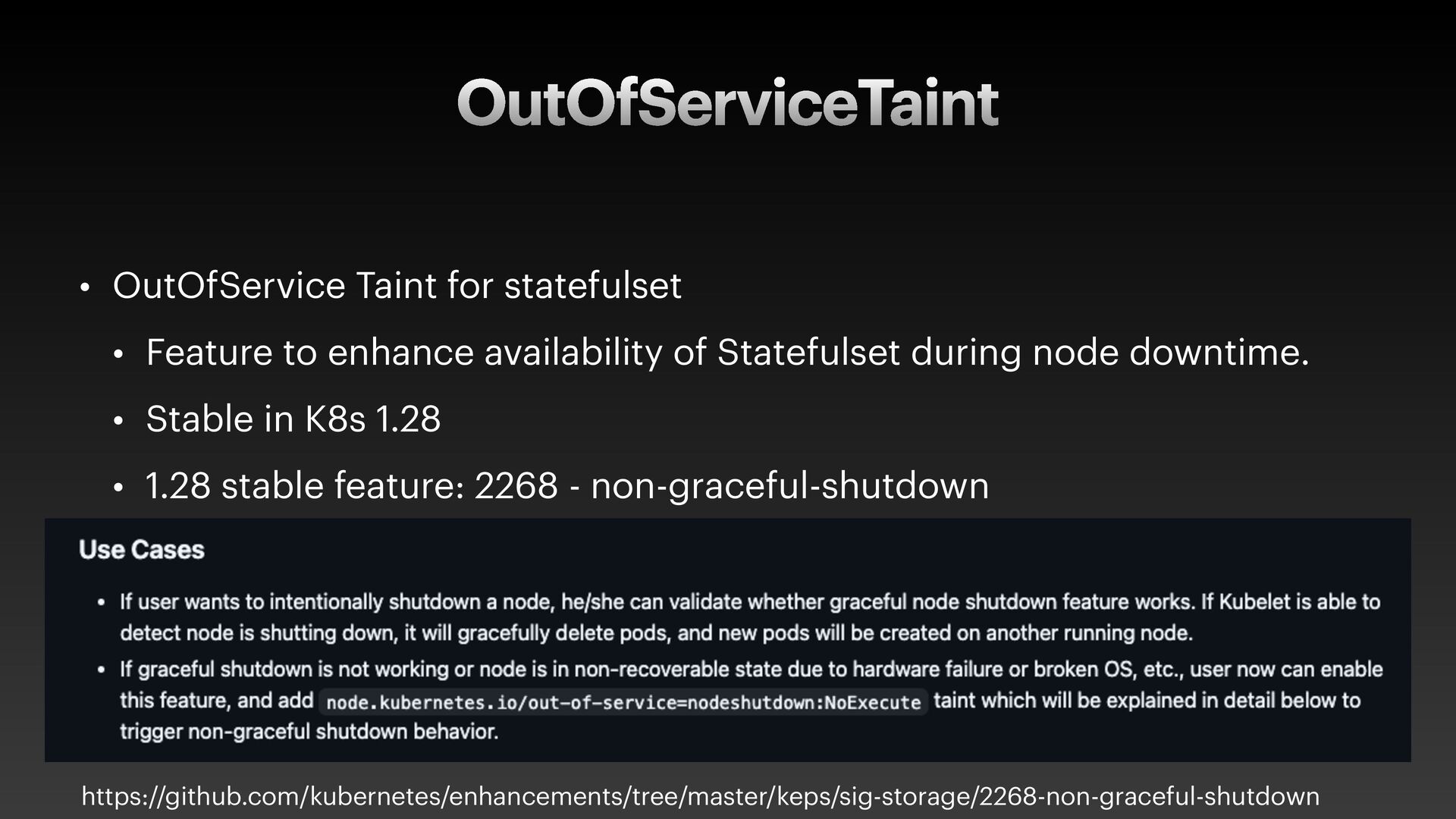 The presentation slides by HungWei Chiu provide an in-depth operational discussion of Kubernetes self-healing and failover design, particularly focusing on the differences between stateless and stateful applications. The source explains that stateless pods will eventually be redeployed following a node failure, with a total recovery time of approximately 350 seconds by default, determined by node health detection (50 seconds) and pod eviction timeouts (300 seconds). Conversely, stateful pods are not automatically redeployed upon node failure, requiring manual intervention due to challenges like persistent volume unmounting. Key factors discussed for failover include the time to declare a node unhealthy using Kubelet lease objects and the time until pods are evicted using taints and tolerations. The source also introduces the OutOfServiceTaint as a manual solution to accelerate the recovery of StatefulSets by reducing the default six-minute volume unmount timeout during node downtime.
