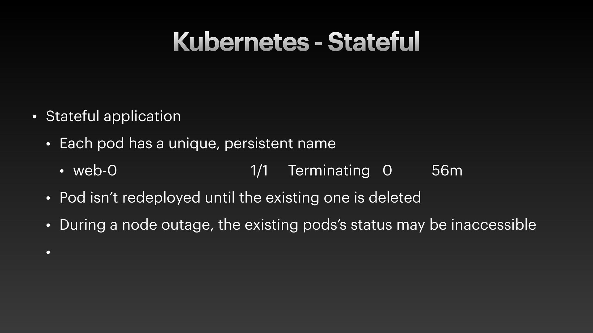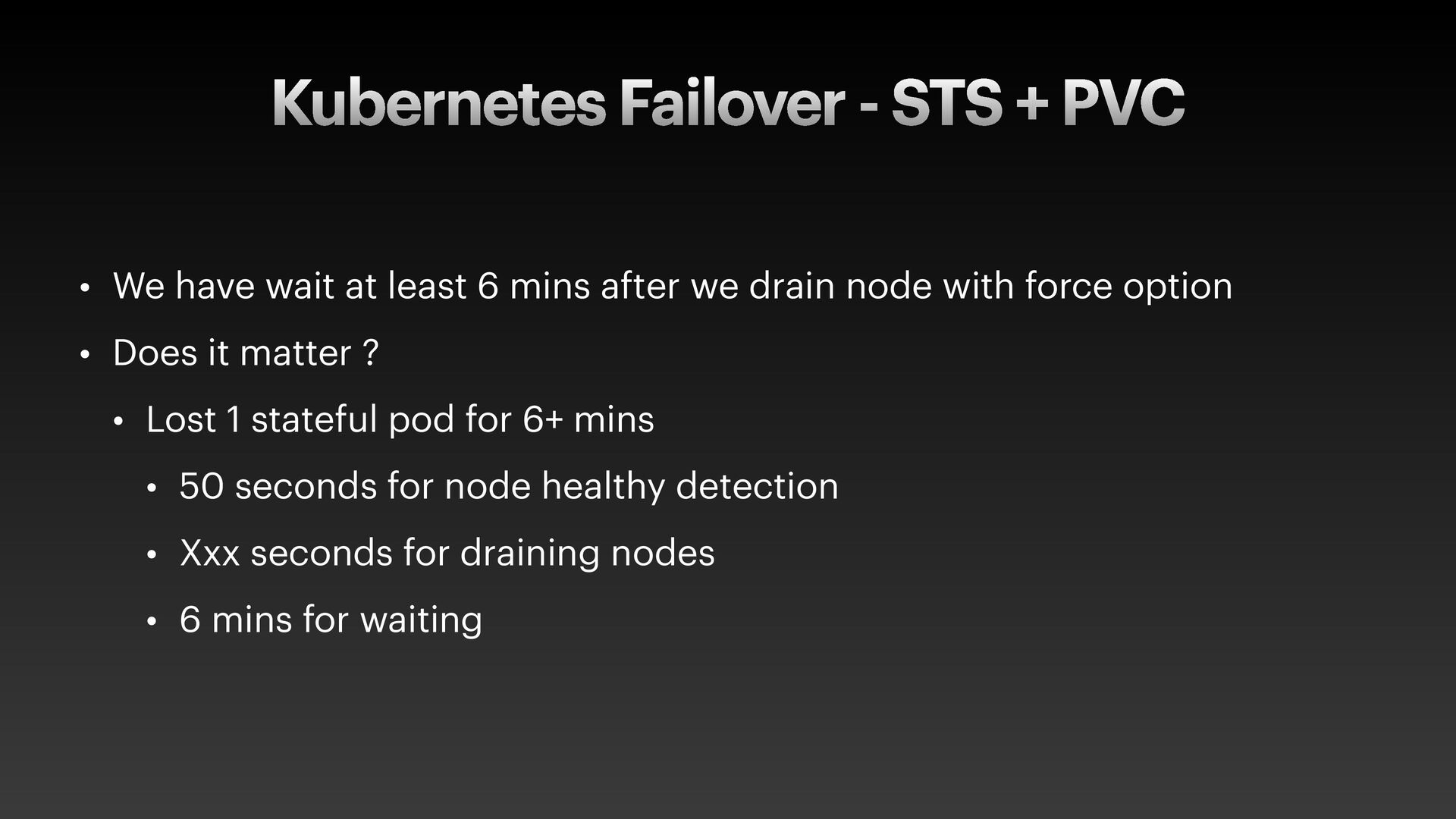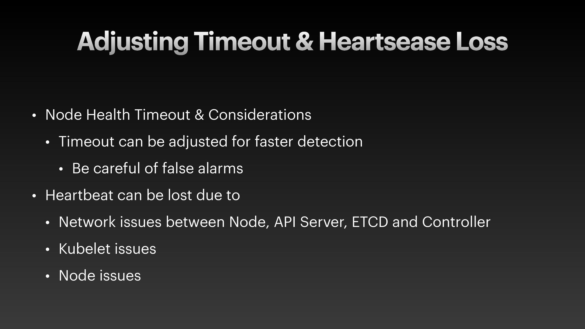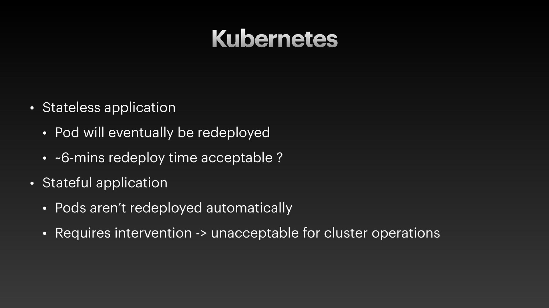 The presentation slides by HungWei Chiu provide an in-depth operational discussion of Kubernetes self-healing and failover design, particularly focusing on the differences between stateless and stateful applications. The source explains that stateless pods will eventually be redeployed following a node failure, with a total recovery time of approximately 350 seconds by default, determined by node health detection (50 seconds) and pod eviction timeouts (300 seconds). Conversely, stateful pods are not automatically redeployed upon node failure, requiring manual intervention due to challenges like persistent volume unmounting. Key factors discussed for failover include the time to declare a node unhealthy using Kubelet lease objects and the time until pods are evicted using taints and tolerations. The source also introduces the OutOfServiceTaint as a manual solution to accelerate the recovery of StatefulSets by reducing the default six-minute volume unmount timeout during node downtime.