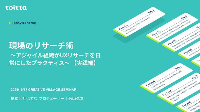 2024/10/17開催 現場のリサーチ術~アジャイル組織がUXリサーチを日常にしたプラクティス~第2回 【実践的手法編】 | CREATIVE VILLAGE SEMINAR の登壇資料です。