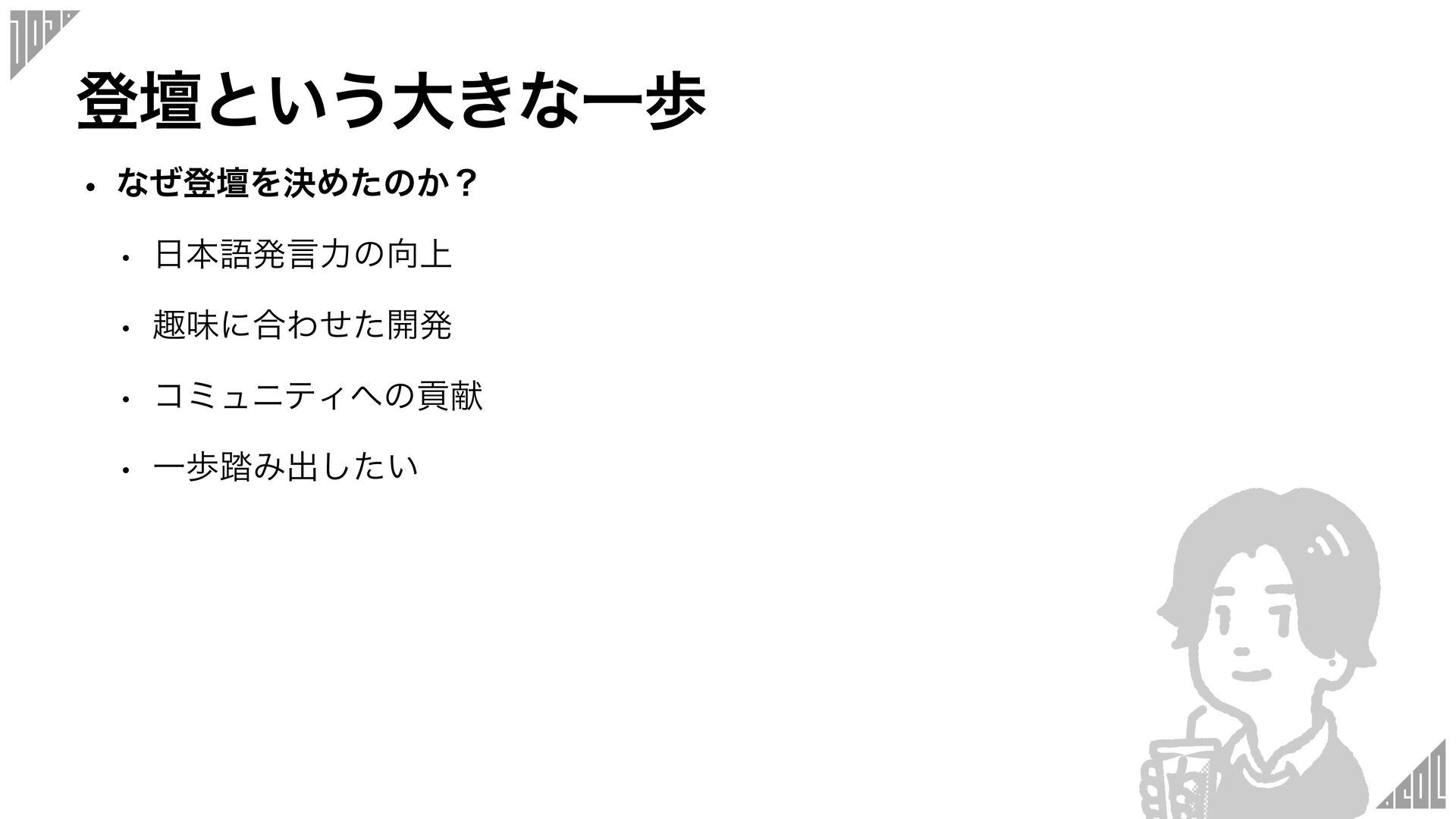 ొஃͱ͍͏େ͖ͳҰา w ͳͥొஃΛܾΊͨͷ͔ʁ w ຊޠൃݴྗͷ্ w झຯʹ߹Θͤͨ։ൃ w ίϛϡχςΟͷߩݙ w
