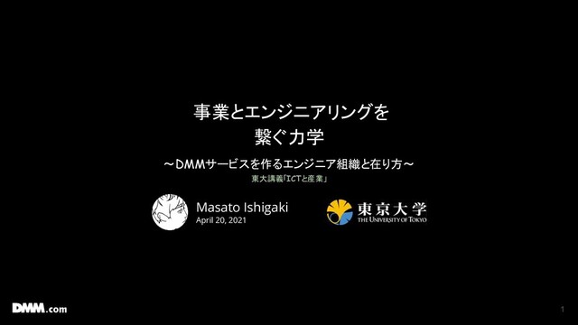 事業とエンジニアリングを 繋ぐ力学 〜DMMサービスを作るエンジニア組織と在り方〜 東大講義「ICTと産業」 1 Masato Ishigaki April 20, 2021