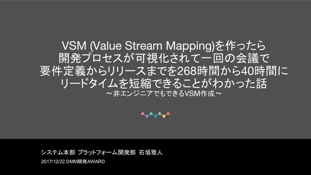 VSM (Value Stream Mapping)を作ったら 開発プロセスが可視化されて一回の会議で 要件定義からリリースまでを268時間から40時間に リードタイムを短縮できることがわかった話 〜非エンジニアでもできるVSM作成〜