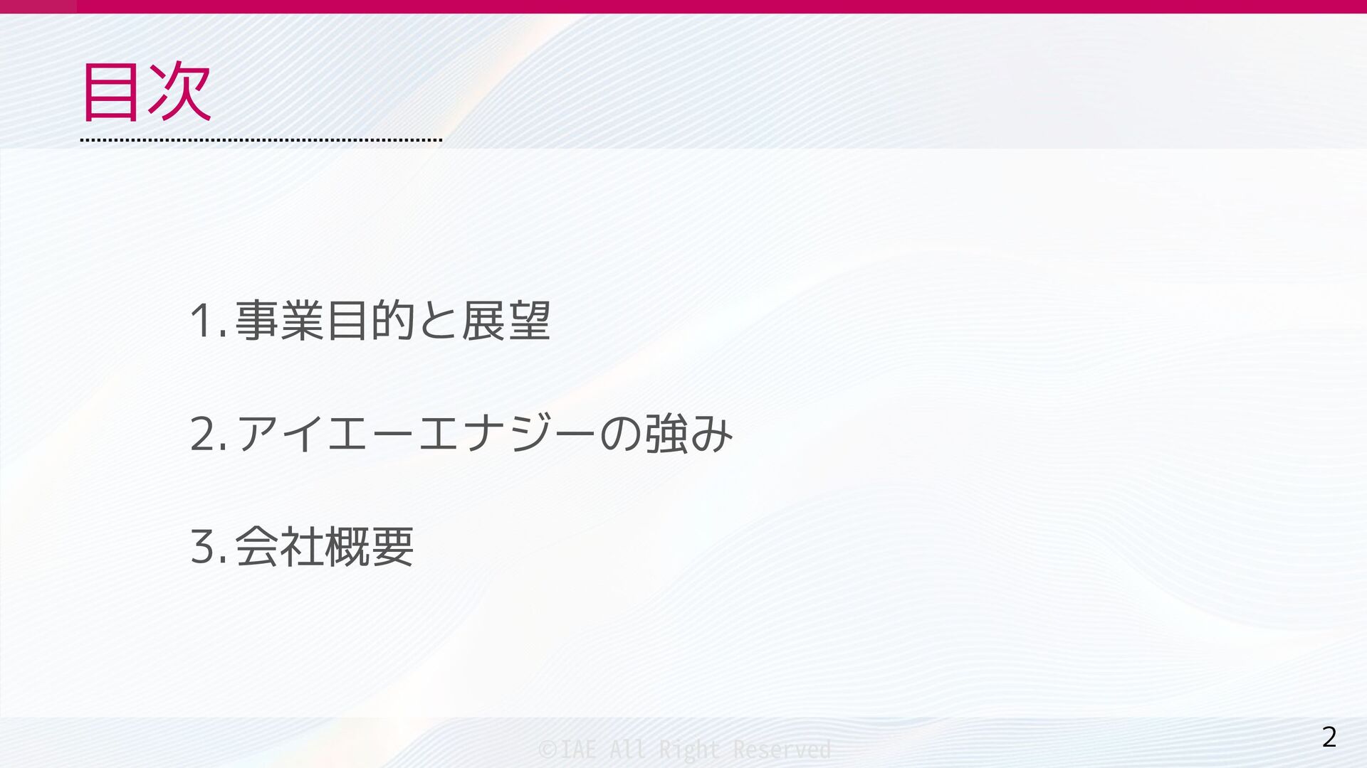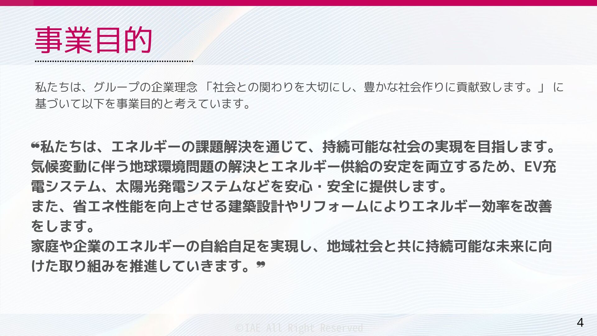 1. 事業目的 ©IAE All Right Reserved 私たちは、グループの企業理念 「社会との関わりを大切にし、豊かな社会作りに貢献致します。」 に 基づいて以下を事業目的と考えています。 ❝私たちは、エネルギーの課題解決を通じて、持続可能な社会の実現を目指します。