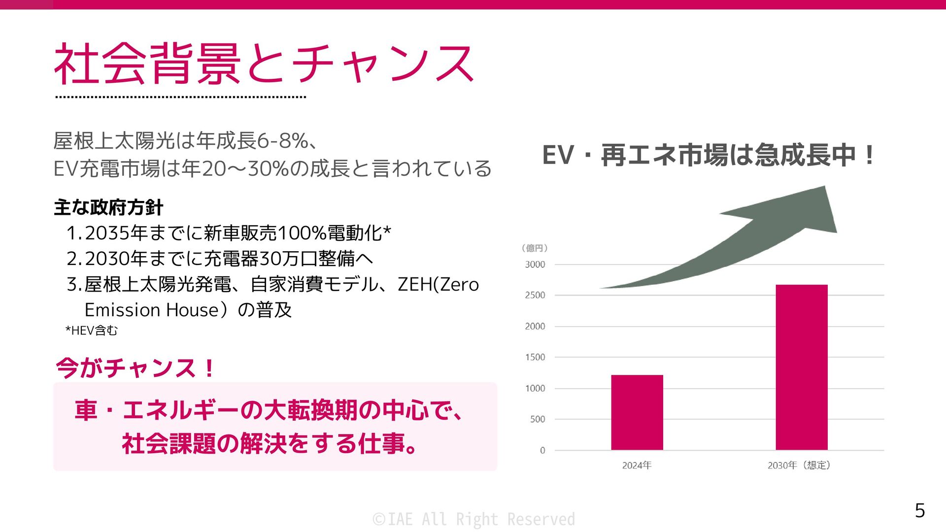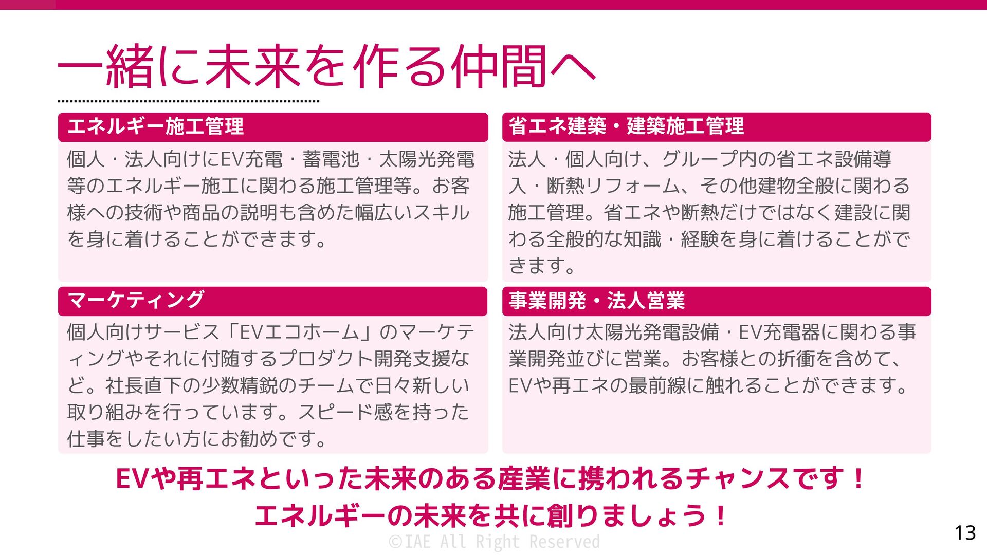 5. 一緒に未来を作る仲間へ ©IAE All Right Reserved EVや再エネといった未来のある産業に携われるチャンスです! エネルギーの未来を共に創りましょう! エネルギー施工管理 マーケティング 事業開発・法人営業