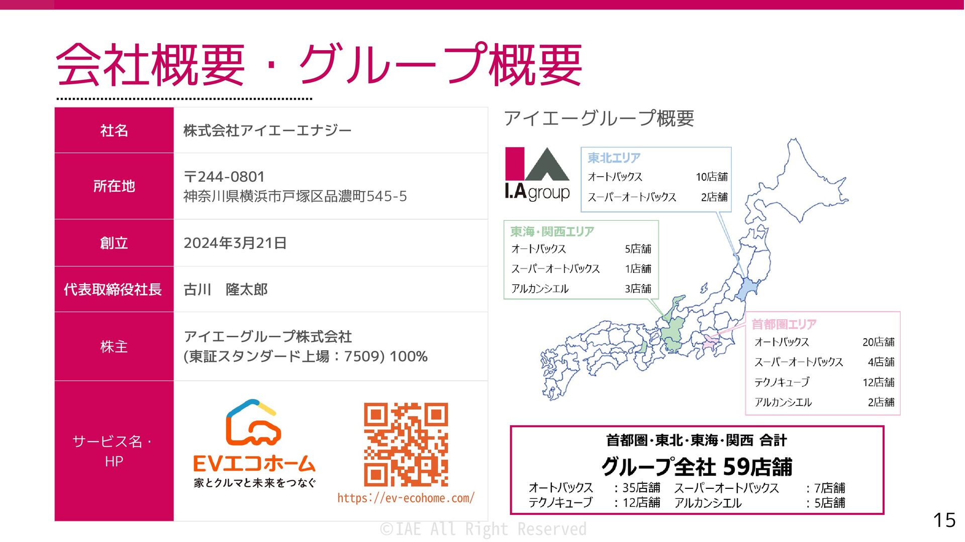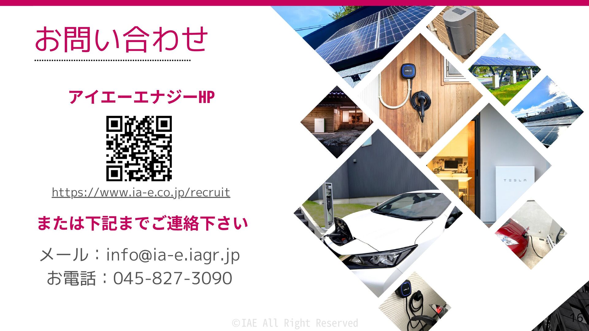 2024年3月21日 代表取締役社長 古川 隆太郎 株主 アイエーグループ株式会社 (東証スタンダード上場:7509) 100% サービス名・ HP 会社概要・グループ概要 アイエーグループ概要 https://ev-ecohome.com/ 15
