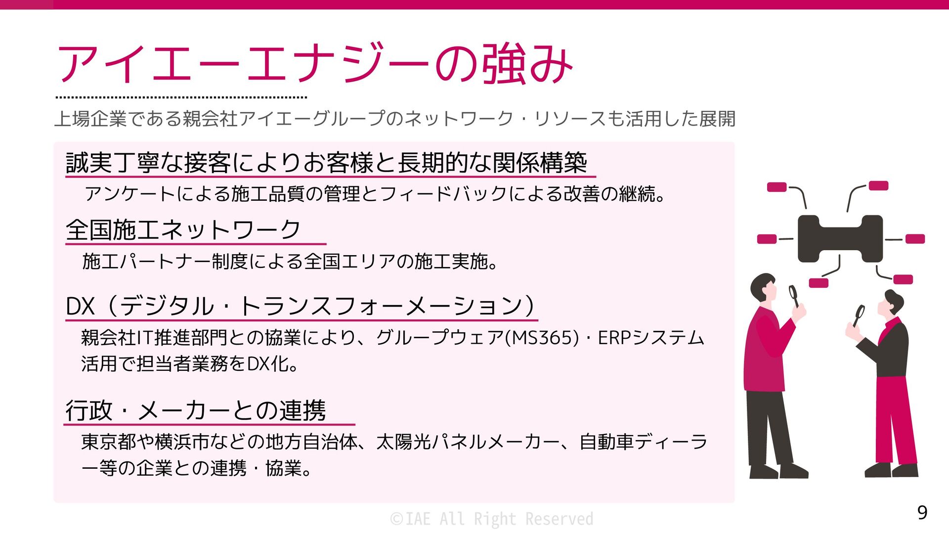 3. アイエーエナジーの強み ©IAE All Right Reserved 誠実丁寧な接客によりお客様と長期的な関係構築  アンケートによる施工品質の管理とフィードバックによる改善の継続。 全国施工ネットワーク  施工パートナー制度による全国エリアの施工実施。 DX(デジタル・トランスフォーメーション)