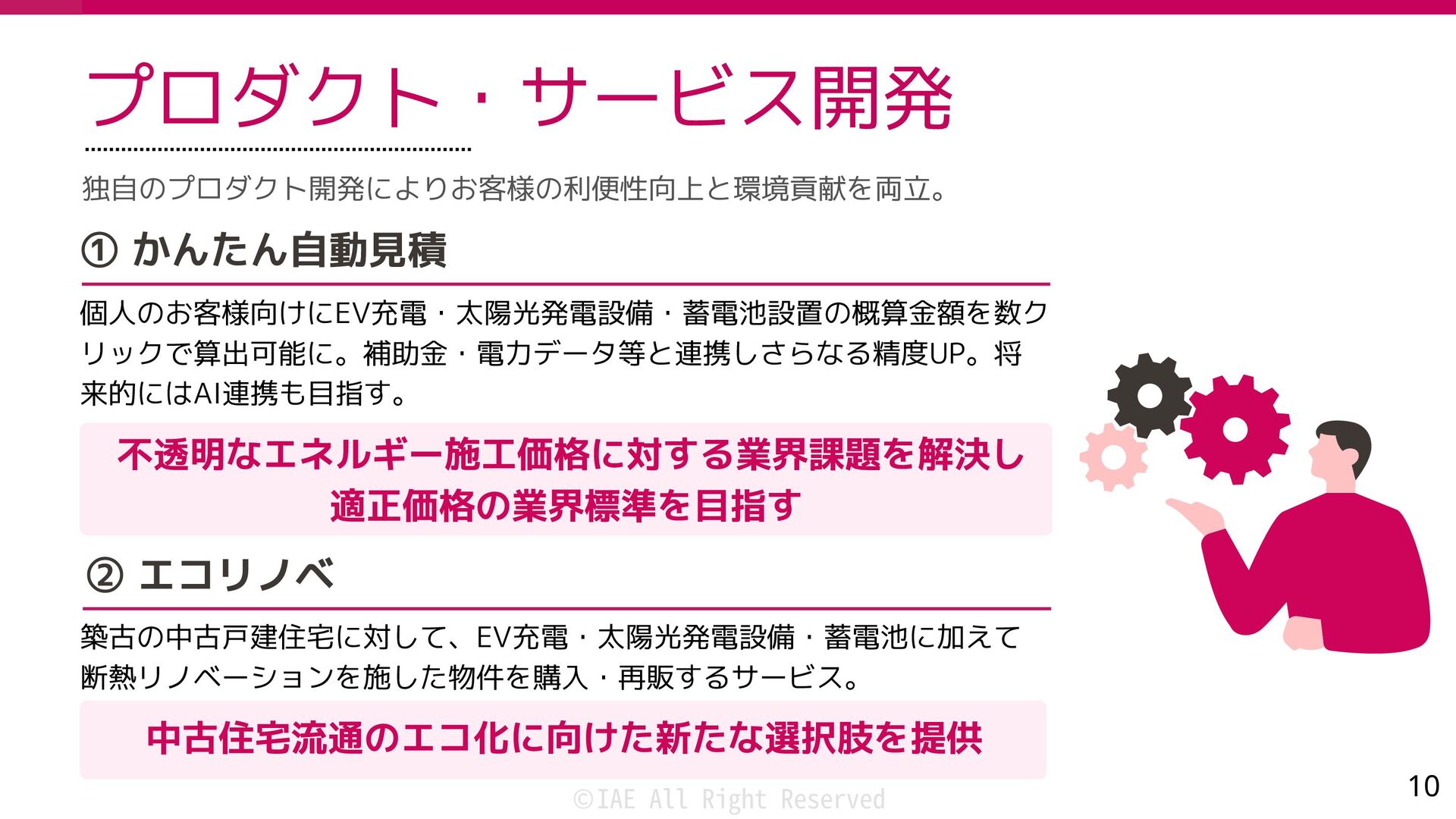 4. プロダクト・サービス開発 ©IAE All Right Reserved ① かんたん自動見積 不透明なエネルギー施工価格に対する業界課題を解決し 適正価格の業界標準を目指す 独自のプロダクト開発によりお客様の利便性向上と環境貢献を両立。