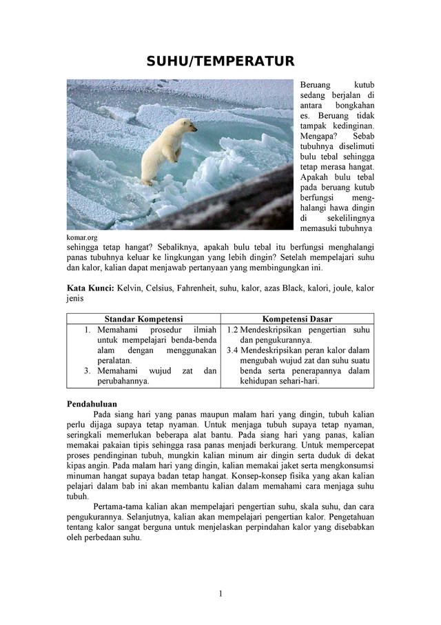 udara terasa panas. Sebaliknya, pada malam hari udara terasa dingin. Bagaimanakah kalian mengetahui perbedaan rasa panas pada siang hari dan dingin pada malam hari? Ketika kalian menyentuh secangkir kopi panas, tangan terasa panas. Sebaliknya, ketika kalian menyentuh segelas es jeruk tangan terasa dingin. Bagaimanakah cara membedakan rasa panasnya kopi dan dinginnya es? Ya, dengan perasaan. Akan tetapi, perasaan tidak dapat menjelaskan perbedaan panas dan dingin dengan teliti. Untuk mengetahui perbedaan panas dan dinginnya benda, diperlukan alat ukur. Konsep suhu (temperatur) berasal dari ide kualitatif tentang “panas” dan “dingin” yang didasarkan atas indera perasa. Suatu benda yang rasanya panas pada umumnya memiliki suhu yang lebih tinggi daripada benda yang dingin. Jadi, suhu merupakan suatu besaran yang menunjukkan ukuran derajat panas atau dinginnya suatu benda. Dapatkah kalian menentukan suhu benda hanya dengan sentuhan atau perasaan? Ketika kalian menyentuh dua zat cair dengan tangan, misalnya bejana berisi air hangat dan bejana berisi campuran air dan es, berdasarkan perasaan kalian dapat menentukan benda yang suhunya lebih tinggi. Air yang suhunya lebih tinggi adalah air yang terasa lebih panas. Akan tetapi, karena hanya dengan perasaan, kalian tidak dapat menentukan suhu benda dengan tepat. Untuk membuktikan bahwa perasaan tidak tepat untuk mengukur suhu, kalian dapat melakukan Kegiatan 4.1. Alat dan Bahan 1. Tiga bejana yang berukuran besar, misalnya ember. 2. Air hangat, air sumur, dan campuran antara es dan air secukupnya. Prosedur Kegiatan 1. Isilah bejana pertama dengan air hangat, bejana kedua dengan air sumur, dan bejana ketiga dengan campuran antara es dan air. 2. Masukkan kedua telapak tangan kalian ke dalam bejana pertama. Diamkan beberapa saat dan rasakan panasnya. Selanjutnya, angkatlah kedua tanganmu dan keringkan dengan lap. Sekarang, celupkan kedua telapak tangan ke dalam bejana ketiga. Diamkan beberapa saat dan rasakan panasnya.Setelah beberapa saat, angkatlah kedua telapak tangan dan keringkan dengan lap. 3. Masukkan telapak tangan kananmu ke dalam bejana pertama dan telapak tangan kirimu ke dalam bejana ketiga. Diamkan beberapa saat dan rasakan keduanya. 4. Pindahkan secara cepat kedua tanganmu ke dalam bejana kedua. Apakah kedua tanganmu masih merasakan hal yang sama seperti pada langkah ke-3? Jika tidak, mengapa? Apakah kesimpulanmu? Berdasarkan Kegiatan 4.1 dapat disimpulkan bahwa suhu yang dirasakan oleh telapak tangan bergantung pada suhu yang dirasakan sebelumnya. Suhu air sumur akan terasa hangat bagi tangan yang sebelumnya bersentuhan dengan benda dingin (campuran air dan es). Akan tetapi, suhu air sumur akan terasa dingin bagi tangan yang sebelumnya bersentuhan dengan benda panas (air hangat). Di samping tidak dapat menentukan Kegiatan 4.1 Menyelidiki Derajat Panas Dinginnya Benda 3