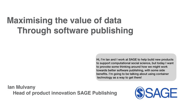 Funders have already begun to request data sharing from their researchers, and the publishing industry is responding with initiatives such as enabling data citation and linking publications to primary data. In this short talk we will ask what might come next? Data itself rarely emerges into the world complete, but often needs a series of computational steps for collection, cleaning and analysis. Up to now sharing of software has usually been a fairly static affair, but software can be a notoriously difficult to get running, with dependencies on operating systems and libraries and host systems. Container technology is making it possible to encapsulate software in a lightweight and robust way that allows sharing of computational environments. We will give an overview of this technology, look at how it is being currently used by researchers, and discuss possible future implications for the publishing industry, both in terms of how we think about core infrastructure, as well as how we might provide better services to authors and readers.