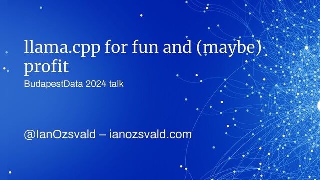 Talk given at BudapestData 2024 on the use of the local `llama.cpp` model runner showing Llama 2, MS Phi 2, Llama 3, CodeLlama and Llava (multimodal) running from a laptop with CPU and/or GPU to answer queries: