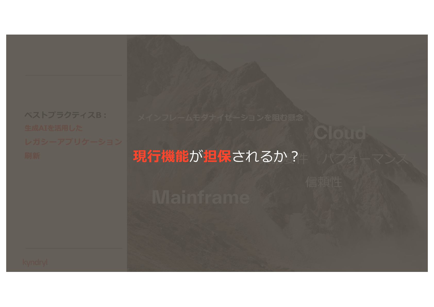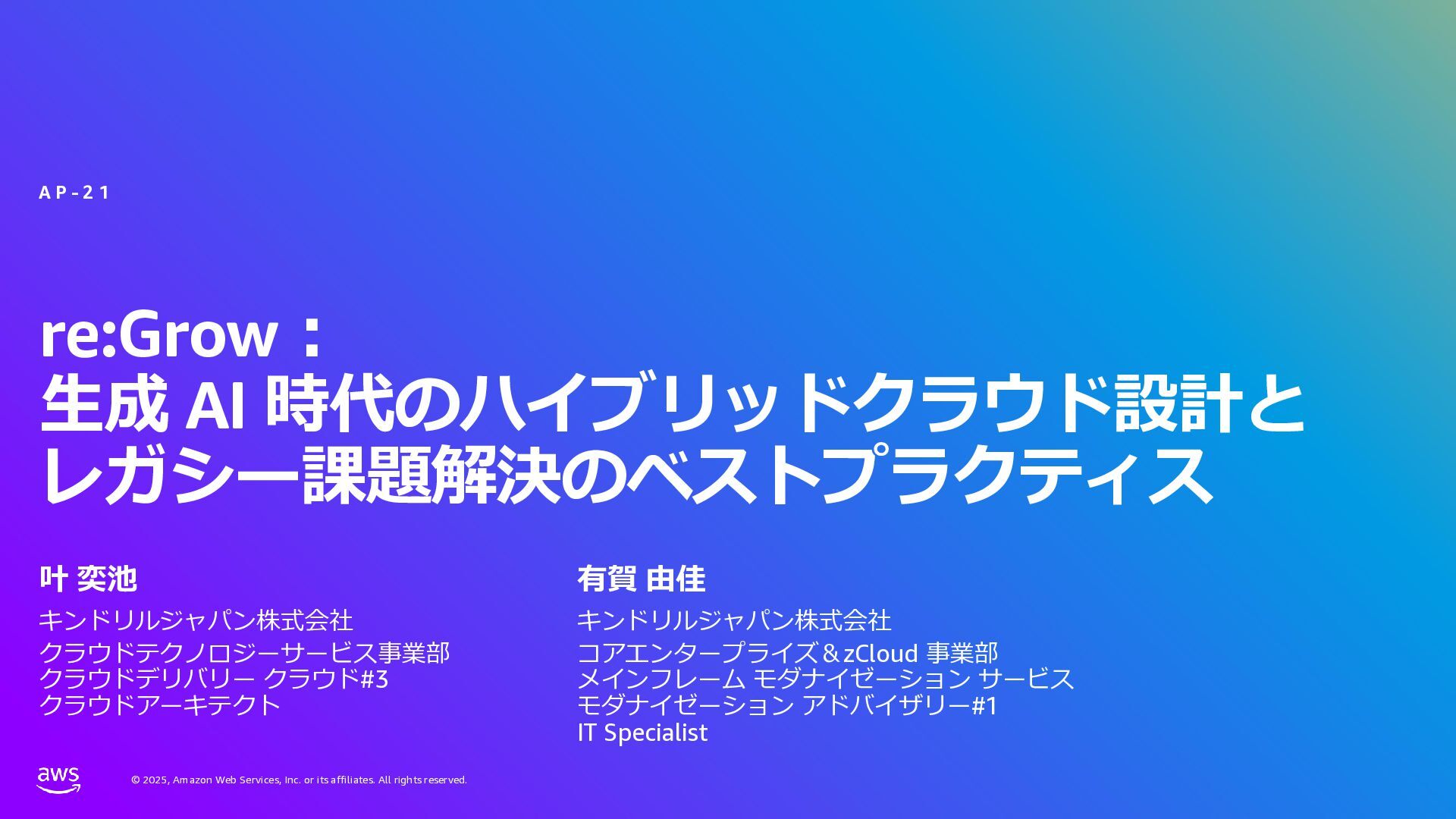 rights reserved. re:Grow: 生成 AI 時代のハイブリッドクラウド設計と レガシー課題解決のベストプラクティス 叶 奕池 A P - 2 1 キンドリルジャパン株式会社 クラウドテクノロジーサービス事業部 クラウドデリバリー クラウド#3 クラウドアーキテクト 有賀 由佳 キンドリルジャパン株式会社 コアエンタープライズ&zCloud 事業部 メインフレーム モダナイゼーション サービス モダナイゼーション アドバイザリー#1 IT Specialist