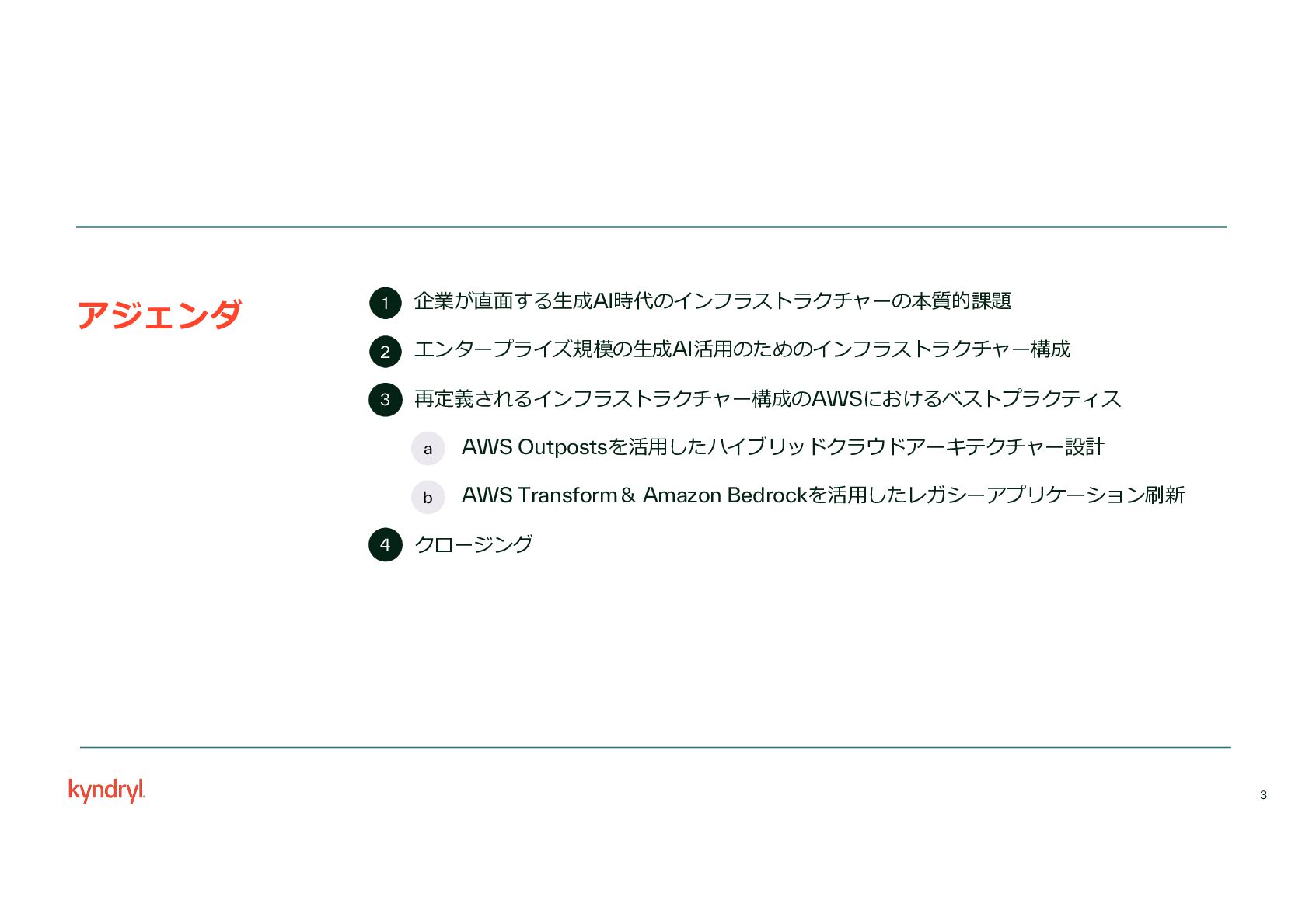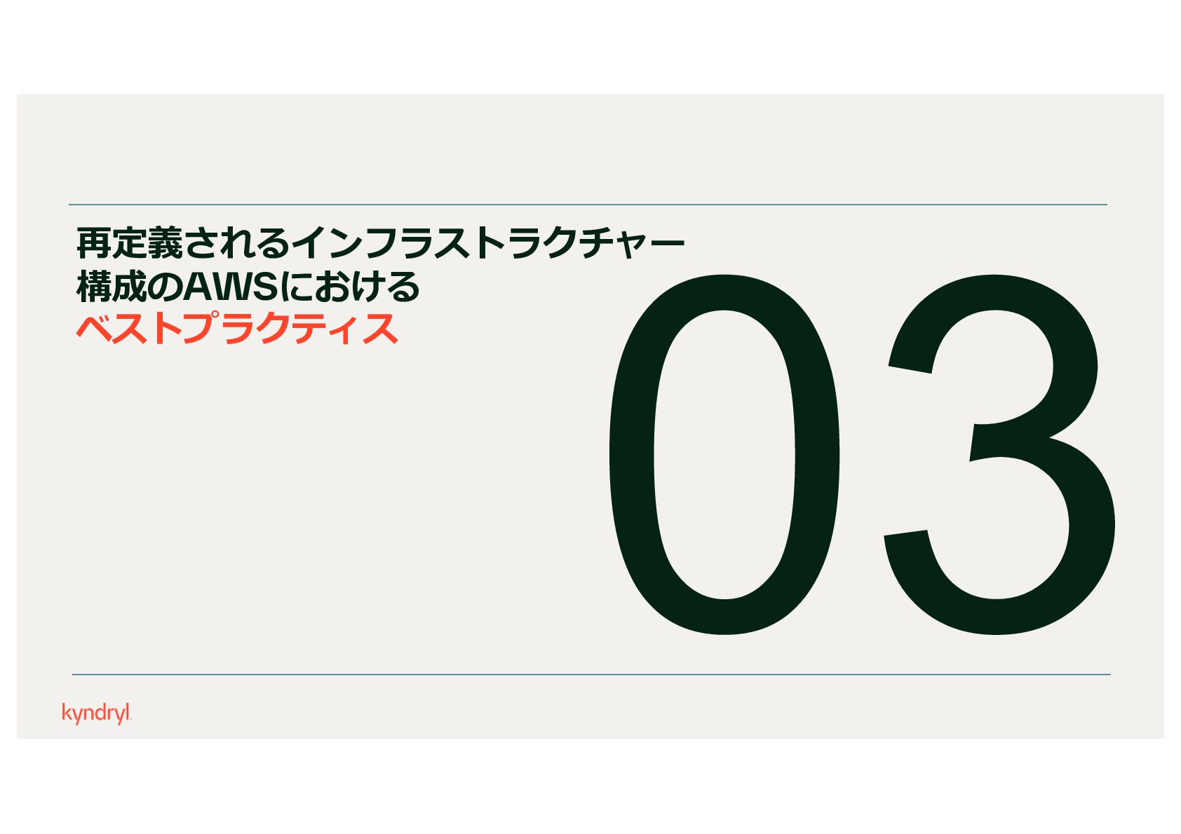 重要です。⼀⽅でオンプレミス由来のレガシーシステムの構成は複雑であり、クラウド移⾏ にも難易度が伴います。 キンドリルでは⻑年培ったインフラマネージドの知⾒を活⽤しながら、AWSへのシステムイ ンフラのモダナイゼーションをご⽀援する体制を⽤意しています。 セッション 会場 I