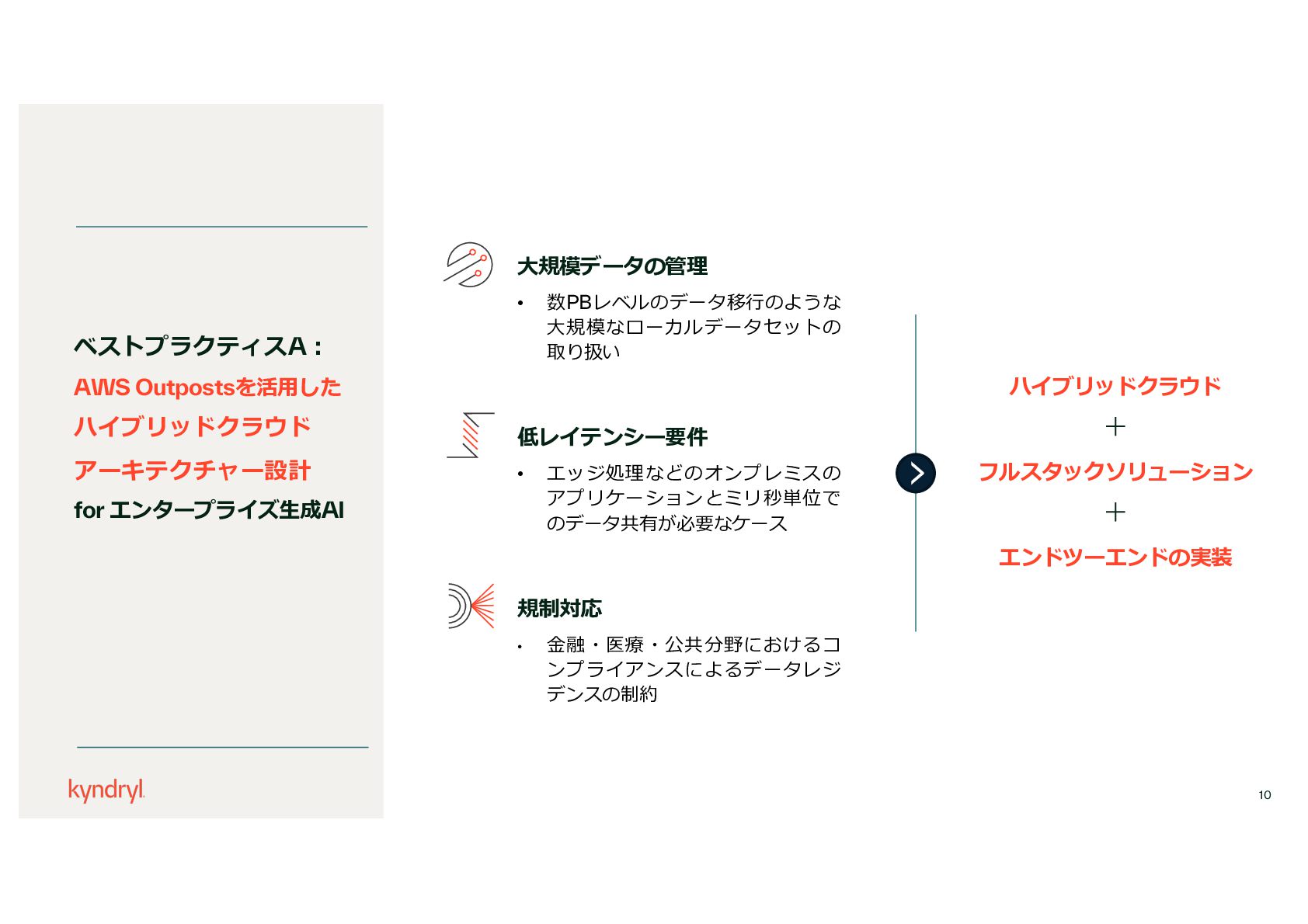 等々 ⽣成AIによる⾰命 ビジネス環境変化 (課題・ニーズ) 技術変化 (ソリューション) IT環境変化 • ⼈材育成 • プロセス改善 • ガバナンス構築 • 等々 技術課題だけでなく、 組織変⾰の課題も • 膨⼤な選択肢の中から、最適なツールや フレームワークを選定する知⾒の⽋如 • ⽣成AIワークロードの稼働基盤を短期間 で設計・構築するためのノウハウ 未解決のペインポイント ⻑きに渡る豊富な実績 エンドツーエンドのご⽀援 フルスタックソリューション